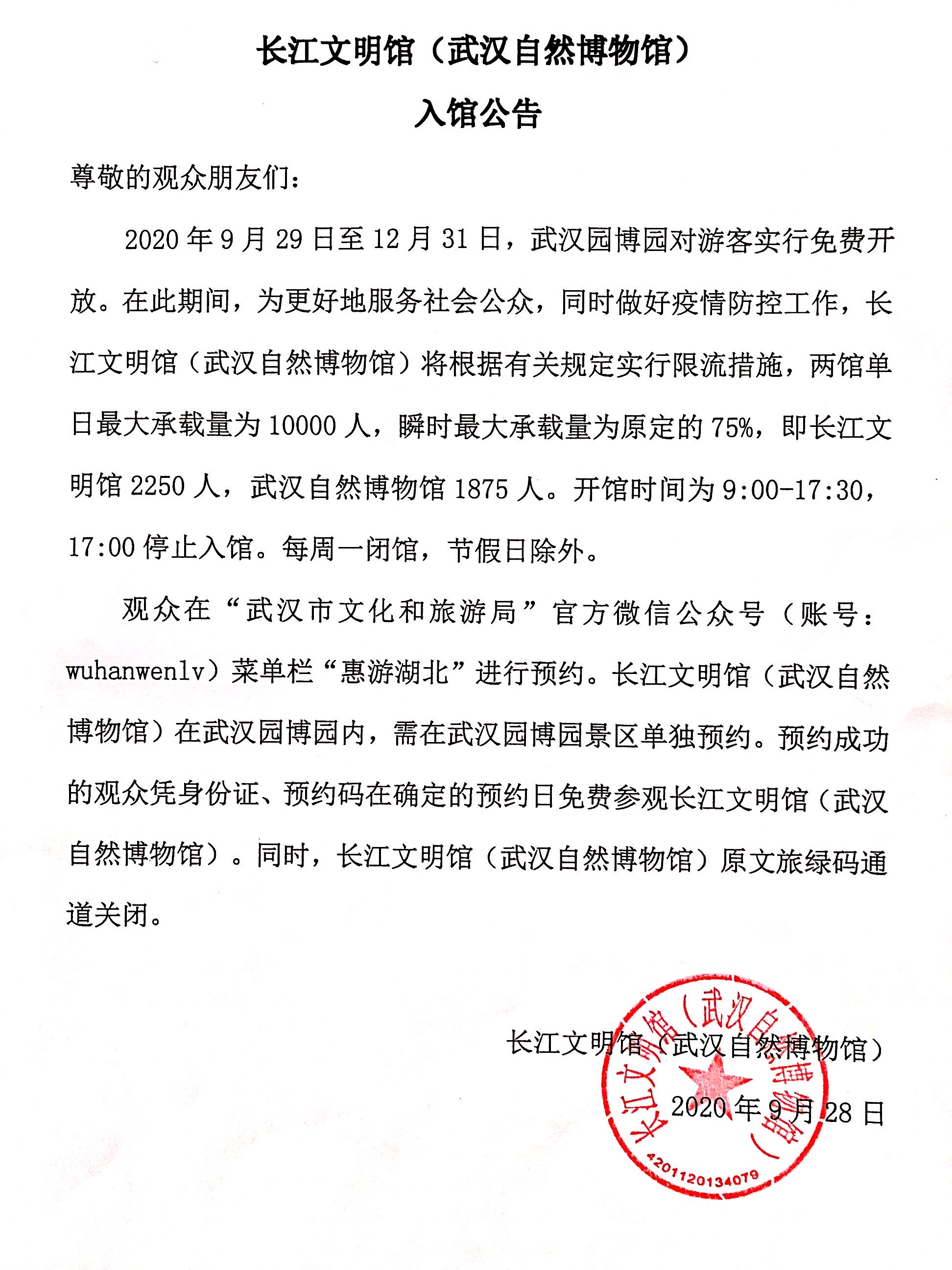 尊敬的观众朋友们:2020年9月29日至12月31日,武汉园博园对游客实行免费开放。