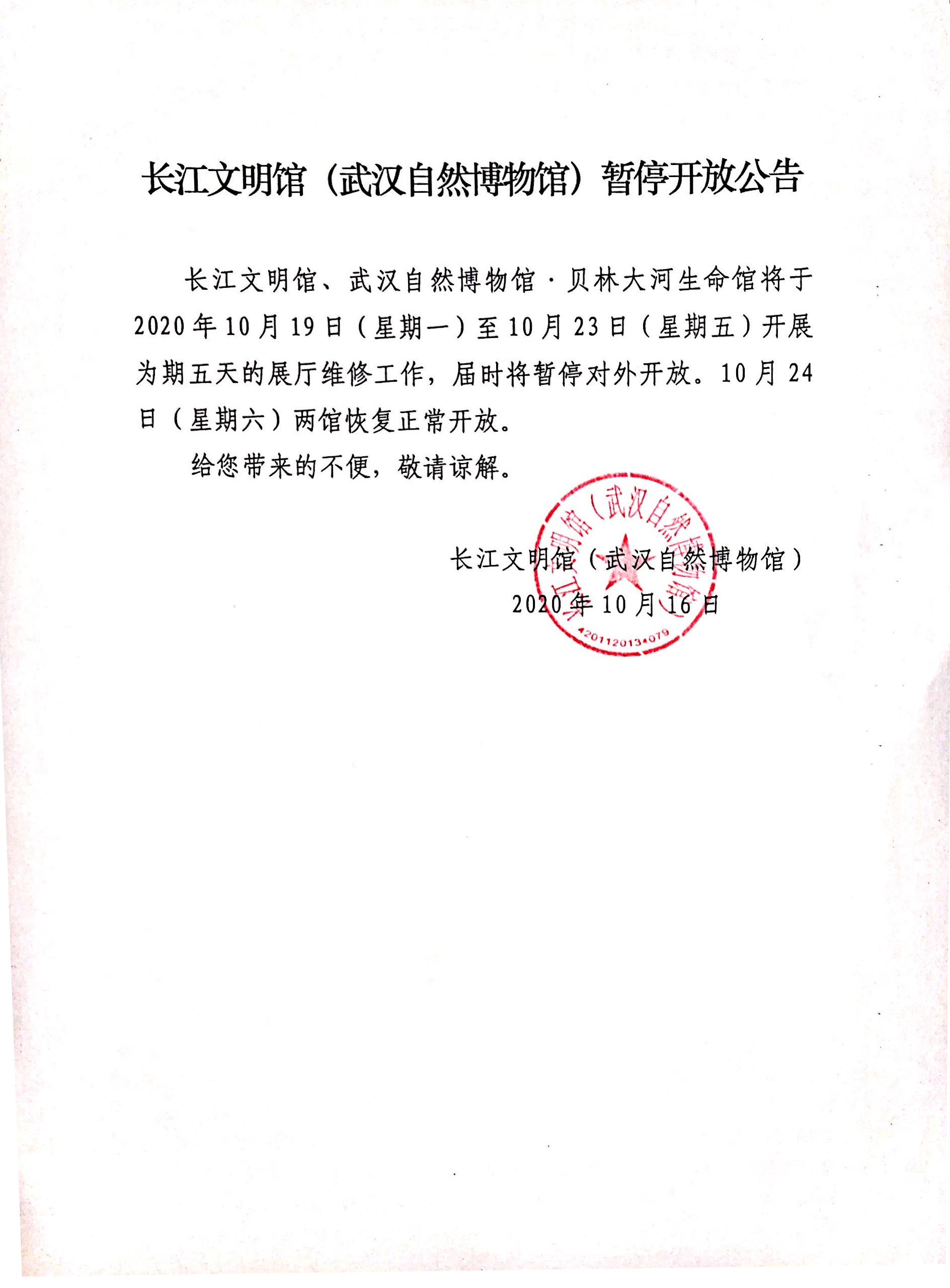 长江文明馆、武汉自然博物馆·贝林大河生命馆将于2020年10月19日(星期一)至10月23日(星期五)开展为期五天的展厅维修工作,届时将暂停对外开放。10月24日(星期六)两馆恢复正常开放。