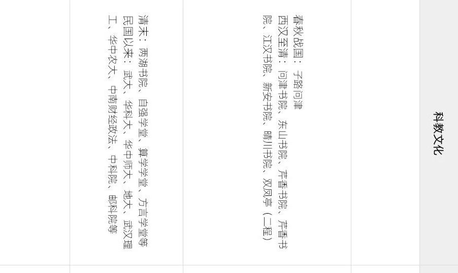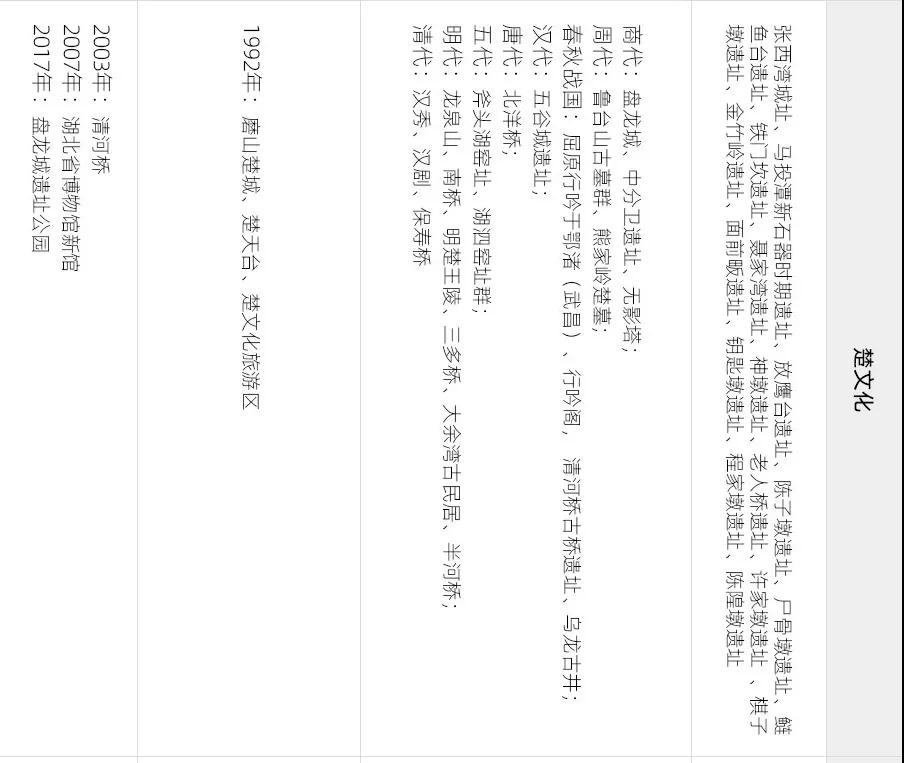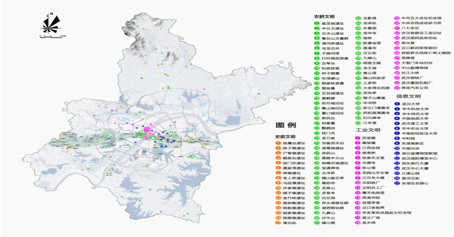 这一资源空间谱系图几乎涵盖了每个朝代和重要历史年代武汉地区的标志性遗存遗迹。例如上古时期的禹功矶,商代的盘龙城、中分卫遗址,周代的鲁台山古墓群、熊家岭楚墓,春秋战国时期的行吟阁、清河桥古桥遗址,汉代的五谷城遗址,三国时期的黄鹄矶、却月城,东晋的临嶂古城遗址,南北朝时期的宝通寺、嵩阳寺、唐代的北洋桥,五代的斧头湖窑址、湖泗窑址群,宋代的古琴台,明代的龙泉山、明楚王陵、龙王庙,清代的两湖书院、保寿桥、归元寺等。到近代,武汉作为全国性工业、科教、文化、商贸中心,建有诸如汉阳铁厂、湖北枪炮厂、武汉大学、华中科技大学、中国地质大学以及东湖高新区、国家自主创新示范区、中法生态城等文化资源(详见附件)。