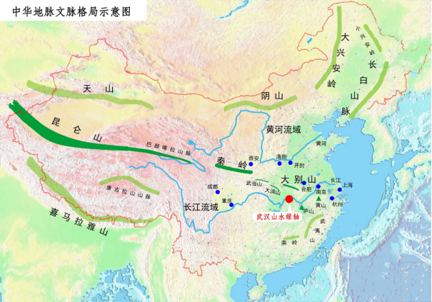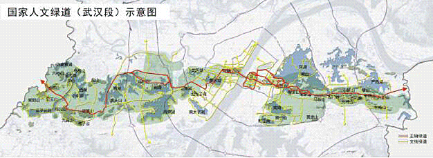 山水人文绿轴,依托武汉市内东西走向山脉及连带湖泊水系一线,汇聚名山名川名湖等自然元素,组合赋存的历史遗迹与现代名胜等人文元素,贯通城市地脉文脉,打造形成生态景观之轴、历史人文之轴、科教创新之轴。