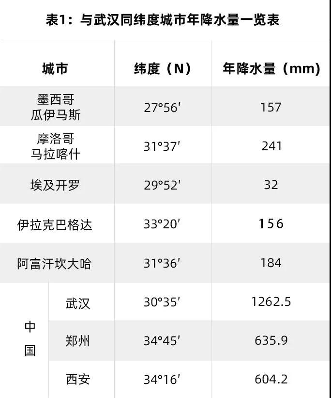 从天文时间来看。世界上几乎所有古老文明都不约而同地诞生在南北半球中低维度20°—40°的地区,武汉位于北纬29°58′—31°22′,处在人类文明生存的黄金线上。长江流域得大自然眷顾,亚洲大陆中部崛起的青藏高原和横断山脉阻挡来自太平洋季风的水汽,致使这里水热资源并富。武汉所处的北温带南部,气候条件得天独厚,降水量高出同纬度地区数倍甚至数十倍(如表1所示),最适宜人类生存发展,是中国乃至世界自然禀赋优越、经济文化潜能巨大的地域。