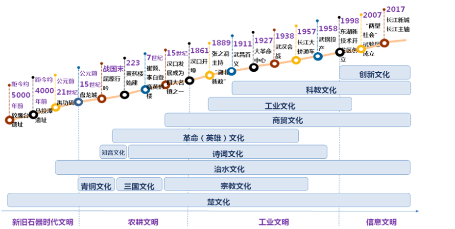 从人文时间来看。武汉有着清晰连贯的长江文明传承发展脉络(如图3所示)。早在8000-6000年前新石器时代早、中期,就有先民在此繁衍生息。从盘龙城到知音故里,从公元223年的黄鹄矶到明清时代的汉口镇,从近代工商业文明发祥到新中国成立后红钢城建立,再到1990年代设立中国光谷以及山水大学,武汉在农业、工业、信息等人类文明类型转换的历史进程中,留下了以青铜文化、知音文化、楚文化、三国文化、宗教文化、诗词文化、商贸文化、工业文化、革命(英雄)文化、科教文化、创新文化等为代表的长江文明传承印记,在相当程度上集约了长江文明乃至中华文明数千年的发展历程。