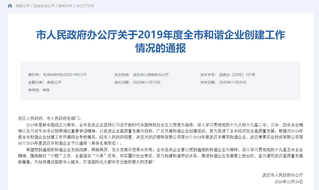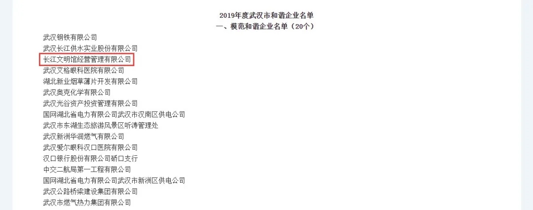 近日,根据“武汉市人民政府办公厅关于2019年度全市和谐企业创建工作考核情况的通报”,长江文明馆经营管理有限公司荣获“2019年度武汉市模范和谐企业”称号,全市仅有20家企业获得该称号。