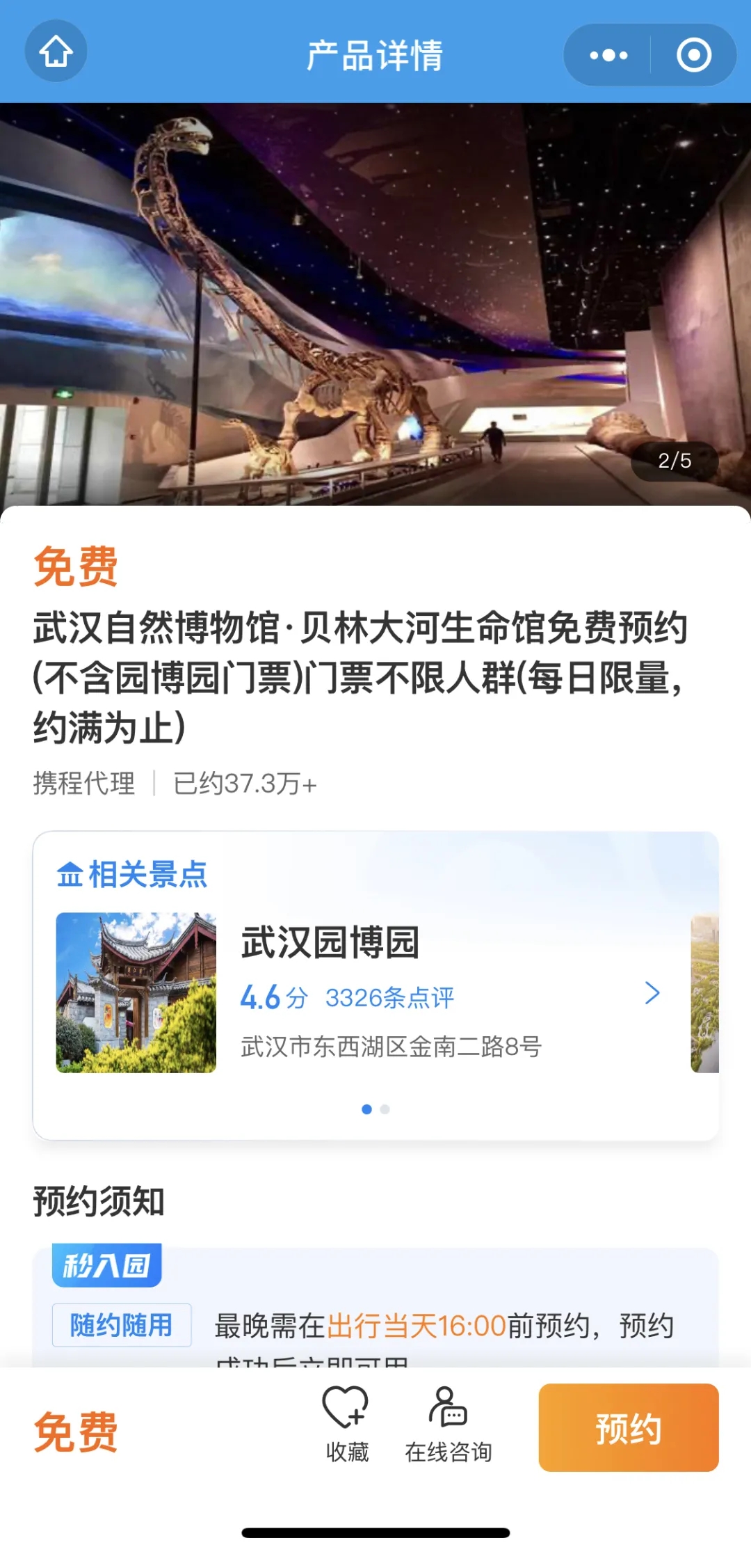 Q:购买园博园门票是否不用线上预约长江文明馆(武汉自然博物馆)?