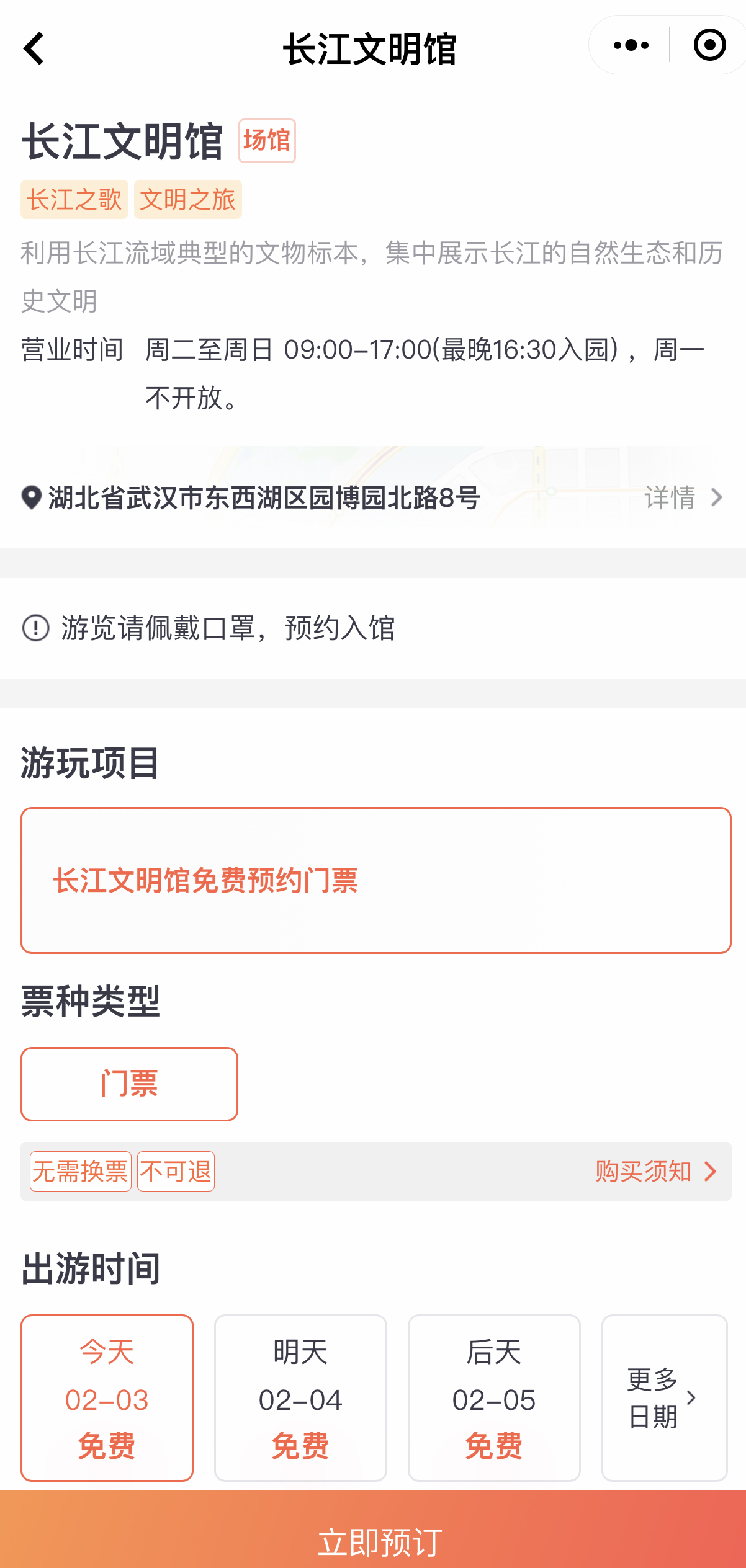 在「景点」中选择长江文明馆,选择出行日期后,点击页面上的「立即预订」按钮,进行预约。