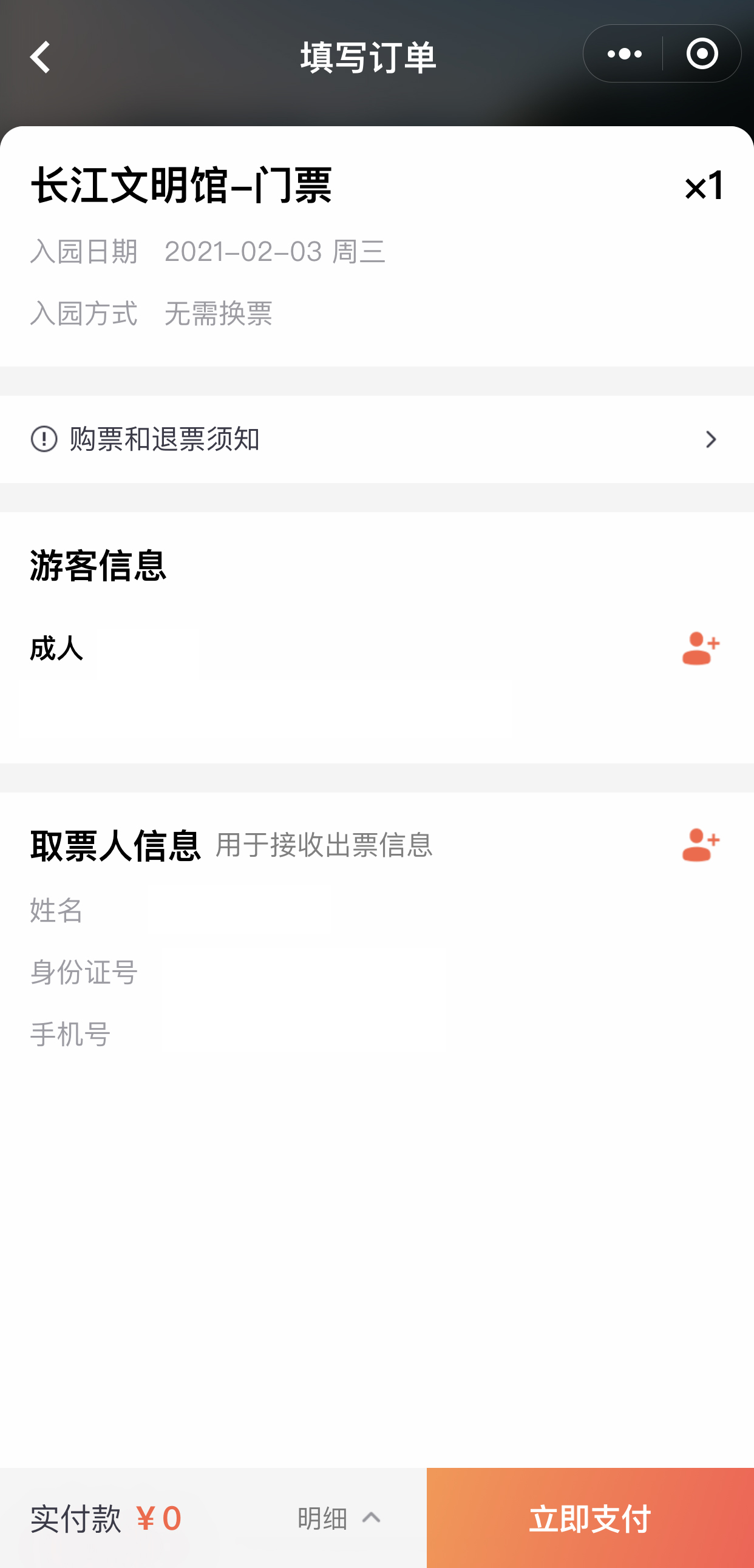 根据页面提示填写个人信息进行实名认证,点击「立即支付」创建订单。