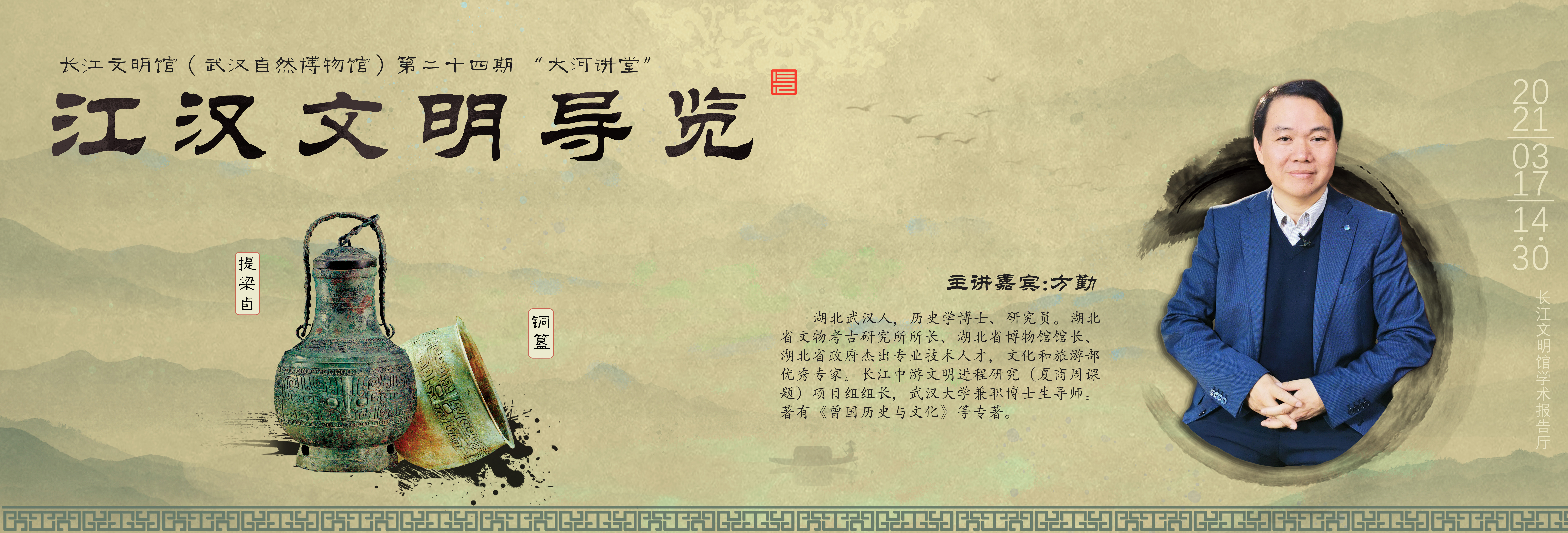 2021年3月17日,长江文明馆(武汉自然博物馆)特邀请湖北省博物馆馆长、湖北省文物考古研究所所长、长江中游文明进程研究(夏商周课题)项目组组长方勤来到大河讲堂,通过网络视频直播形式,对江汉文明和长江文化考古进行讲解,并按照新石器时代、夏商时代、周代的顺序介绍江汉文明发展历程,给大家揭示江汉地区在中华文明起源中所发挥的重要作用和地位。