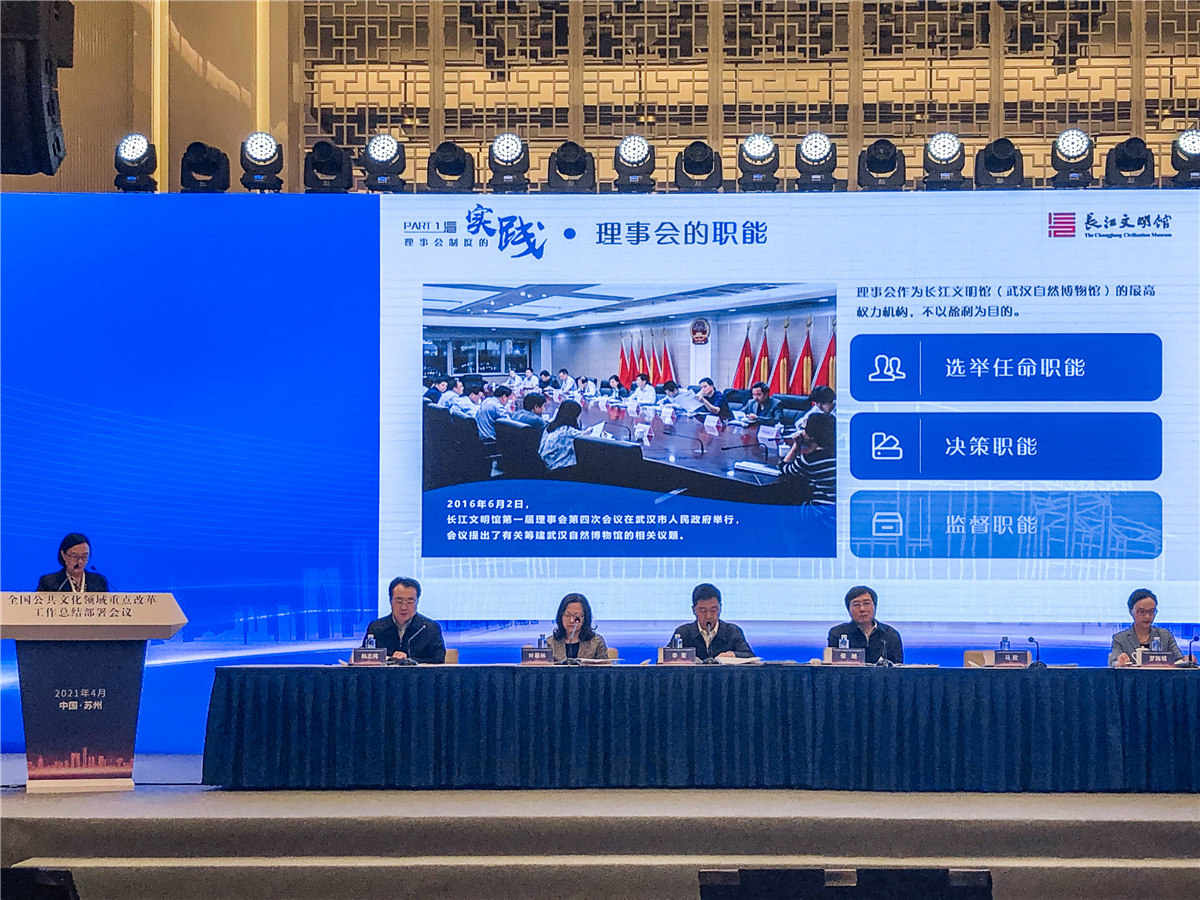 长江文明馆(武汉自然博物馆)馆长李淑云以“长江文明馆(武汉自然博物馆)管理制度的变革与创新”为题作发言,汇报分享了长江文明馆(武汉自然博物馆)建馆五年多以来施行理事会制度的创新经验与成果,并从“理事会制度的实践、特点、收获与体会”三个方面详述了理事会制度在长江文明馆(武汉自然博物馆)运行管理中的重要作用。