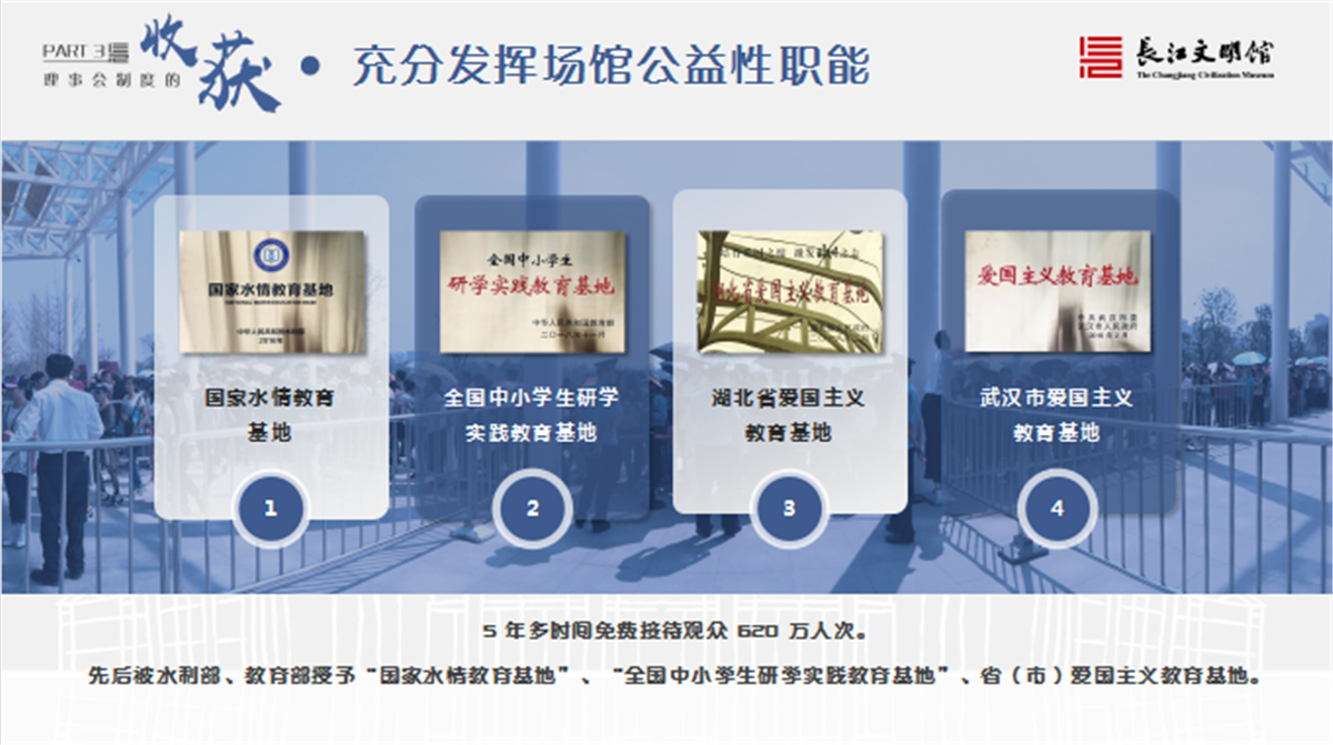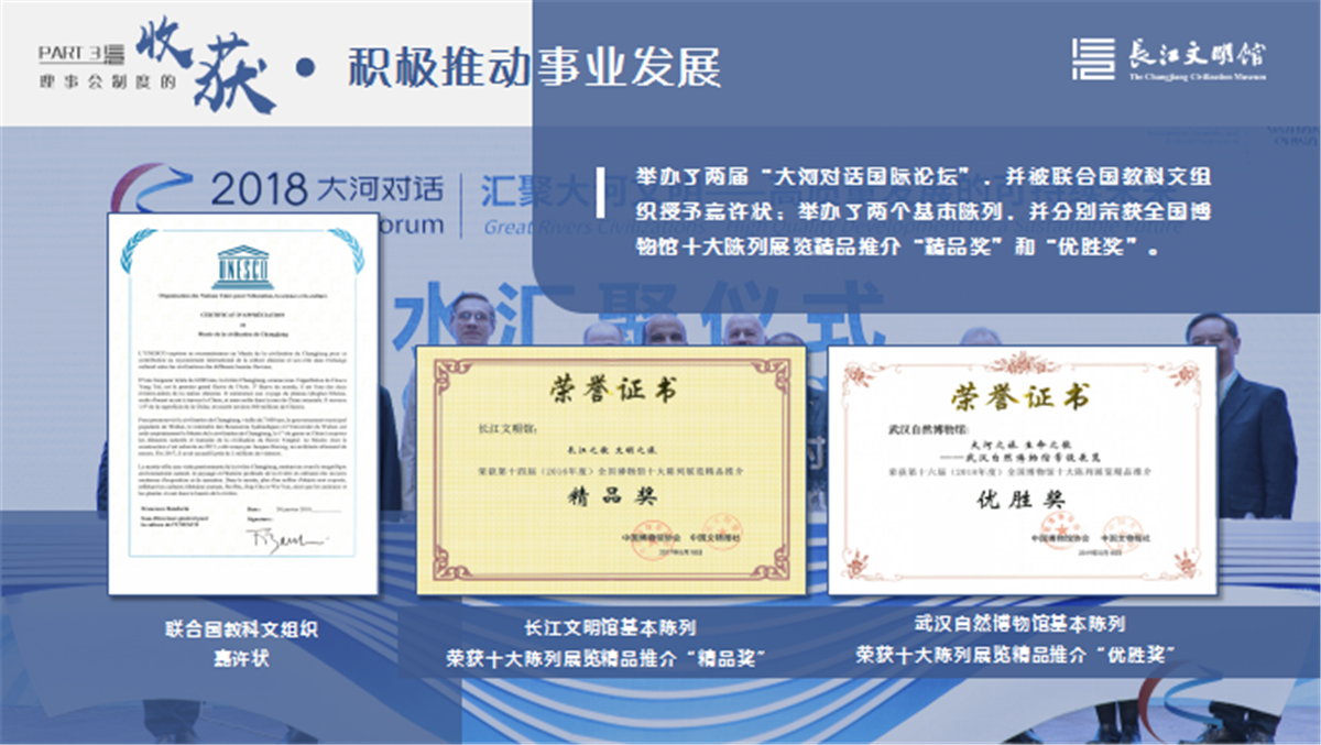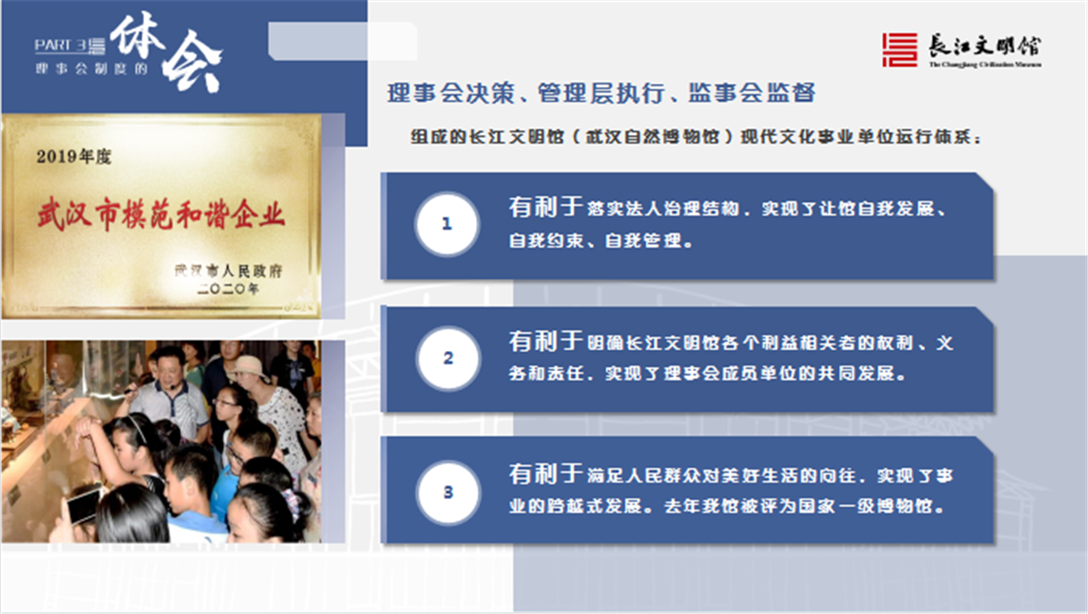理事会决策、管理层执行、监事会监督组成的长江文明馆(武汉自然博物馆)现代文化事业单位运行体系具备三个“有利于”:有利于落实法人治理结构,实现了让馆自我发展、自我约束、自我管理;有利于明确长江文明馆(武汉自然博物馆)各个利益相关者的权利、义务和责任,实现了理事会成员单位的共同发展;有利于满足人民群众对美好生活的向往,实现了事业的跨越式发展。