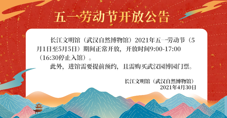 长江文明馆(武汉自然博物馆)2021年五一劳动节(5月1日至5月5日)期间正常开放,开放时间9:00-17:00(16:30停止入馆)。