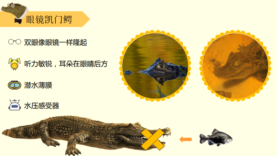 运用“鳄鱼整蛊”游戏的形式让孩子了解眼镜凯门鳄嘴巴上的“水压感受器”