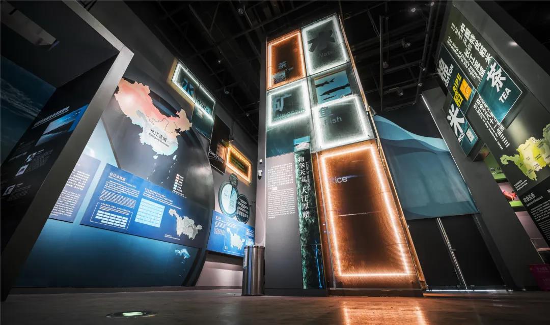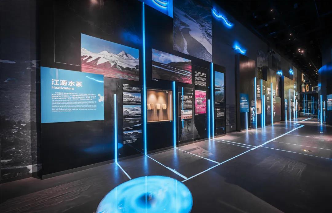 “走进长江”展厅里,蓝色灯光勾勒出长江水系脉络。沿着地面的线条指引,参观者将开启一场浓缩的长江之旅:从长江之源沱沱河出发,途经长江上中下游重要城市,走向长江入海口崇明岛。长江是世界第三大河、中国第一大河,发源于青藏高原的唐古拉山主峰各拉丹冬雪山西南侧,自西向东流经青海、四川、西藏、云南、重庆等11个省区市,注入东海。长江支流延伸至贵州、甘肃、陕西等8个省区,流域面积约180万平方公里,约占中国国土面积的18.8%。