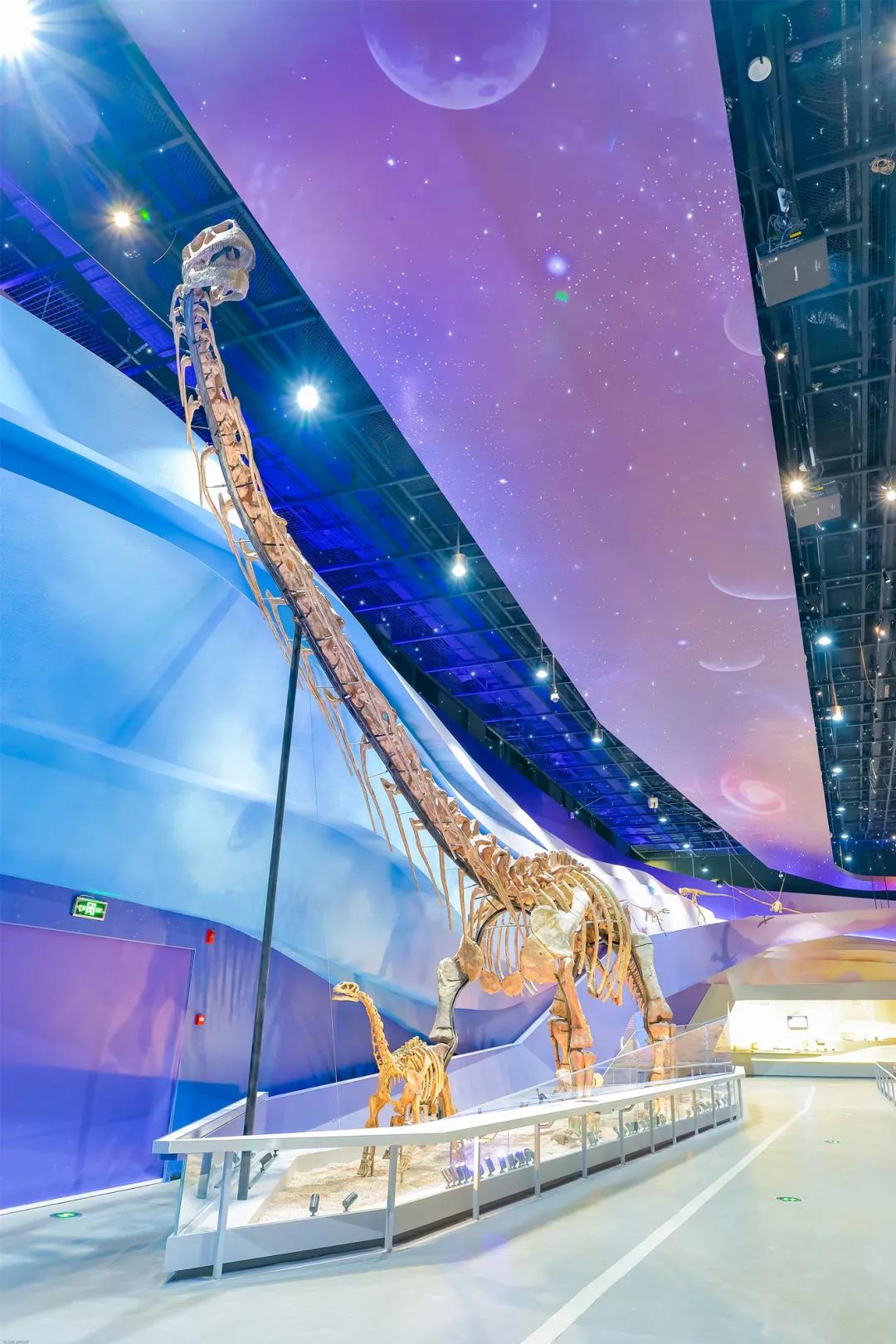 进入展厅,人们首先会被来自侏罗纪时代的庞然大物——中加马门溪龙化石所震撼。马门溪龙是中国发现的体型最大的蜥脚类恐龙之一,颈部特别长。这具化石出土于新疆奇台县,2016年修复装架完成,高7.5米,长24米,脖子就有12米长。