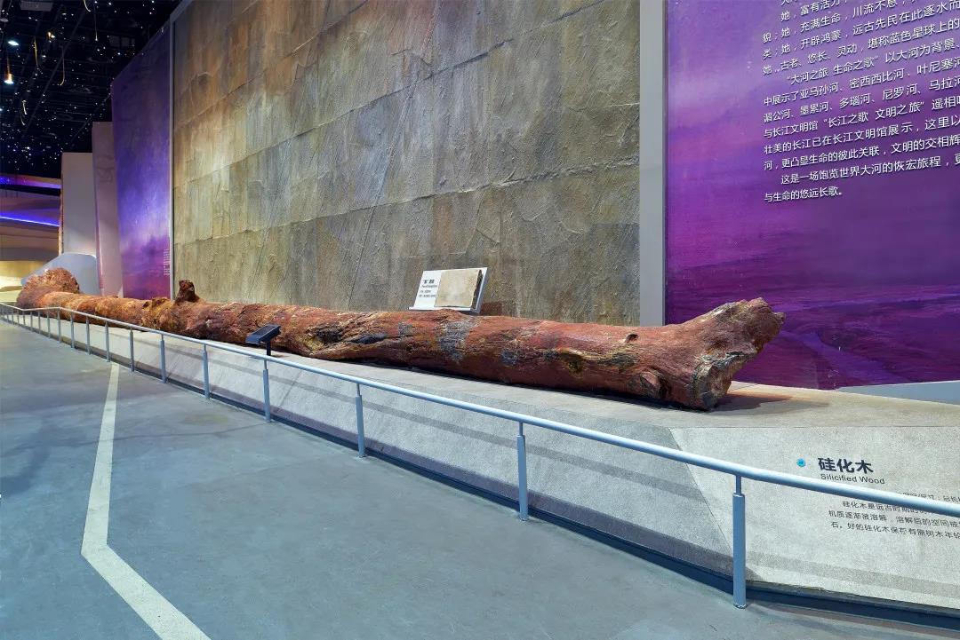 在马门溪龙化石旁,放置着另一件“镇馆之宝”——同样出自新疆奇台的硅化木。它由侏罗纪时代的高大乔木石化而成,树形保存完好,木质结构清晰,长37米左右,根部最大直径2.7米,是国内博物馆展出的最长的硅化木。