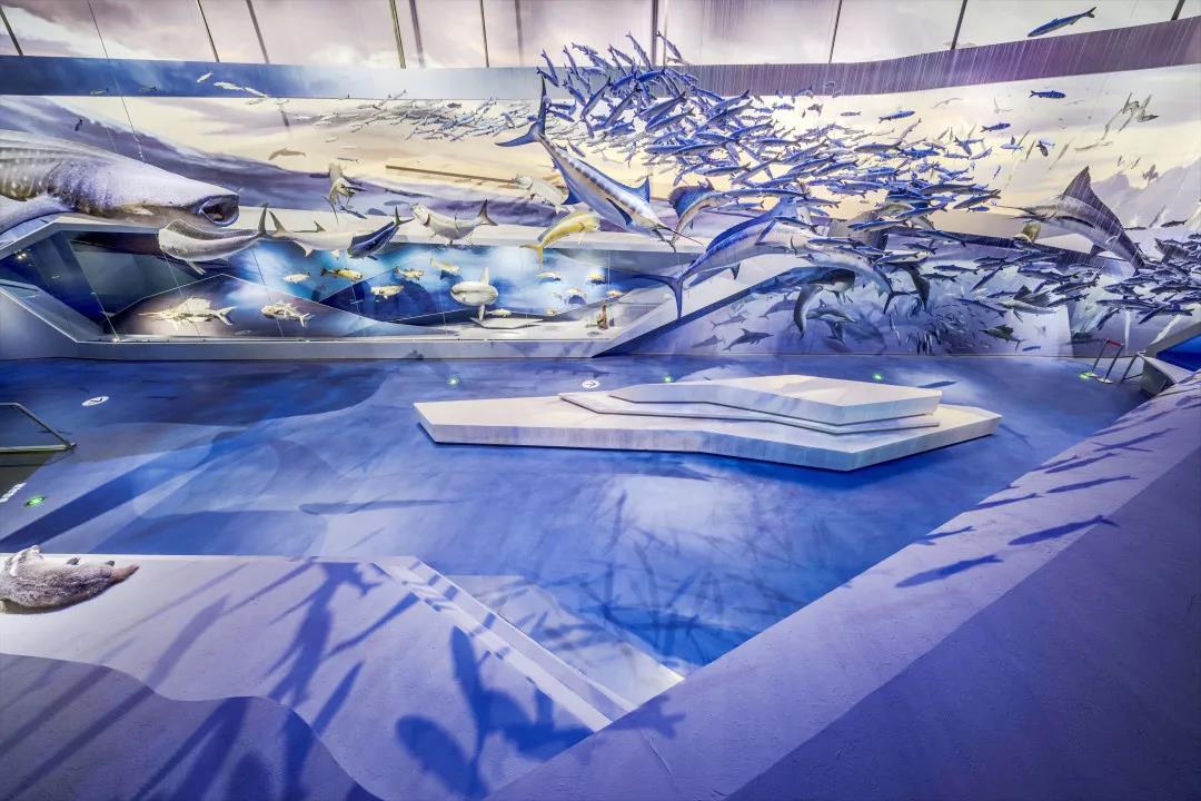 步入“大河珍灵”展区,亚马孙河、密西西比河、叶尼塞河、尼罗河、黄河等大河景观次第展开。亚马孙河孕育的热带雨林里,粗壮的亚马孙森蚺与凶狠的凯门鳄正在殊死搏斗。密西西比河流域,5.4米长的巨大鲸鲨与鱼群热情共舞。进入叶尼塞河流域,仿佛置身于冰雪王国,北极熊、北极狐、雪狼等雪地动物神出鬼没。转入尼罗河流域,非洲草原的热浪滚滚而来,大树下蹒跚前行的非洲象、草原上奔腾的瞪羚、河水中狩猎的尼罗鳄、叼着幼狮回望来时路的母狮……所有动物栩栩如生,如同影片《狮子王》里的场景。