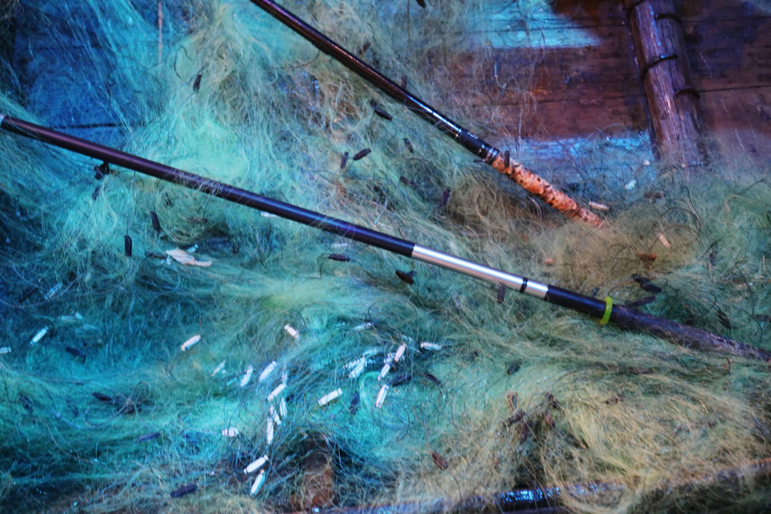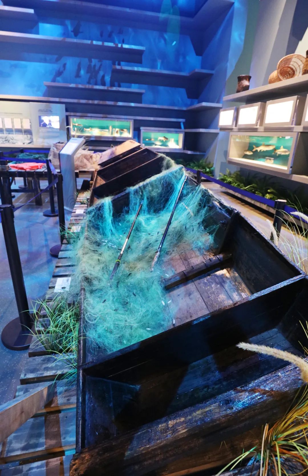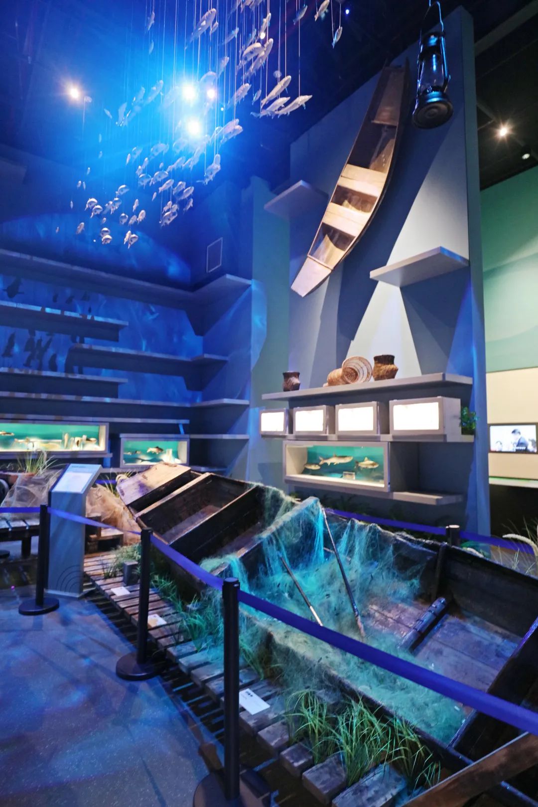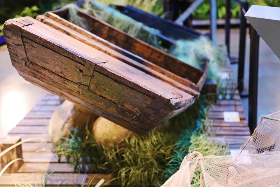受水域污染、过度捕捞等影响,长江水生生物的生存环境日趋恶化,生物多样性指数持续下降。长江文明馆通过武汉市农业综合执法支队联系到江夏区农业农村局和江夏区南北咀综合开发总公司,征集到退捕的渔船、收缴的渔具等“长江十年禁渔计划”见证物共20件,打造集科技、创意、视觉艺术于一体的全新展厅,在流动的光影里展现长江之美。