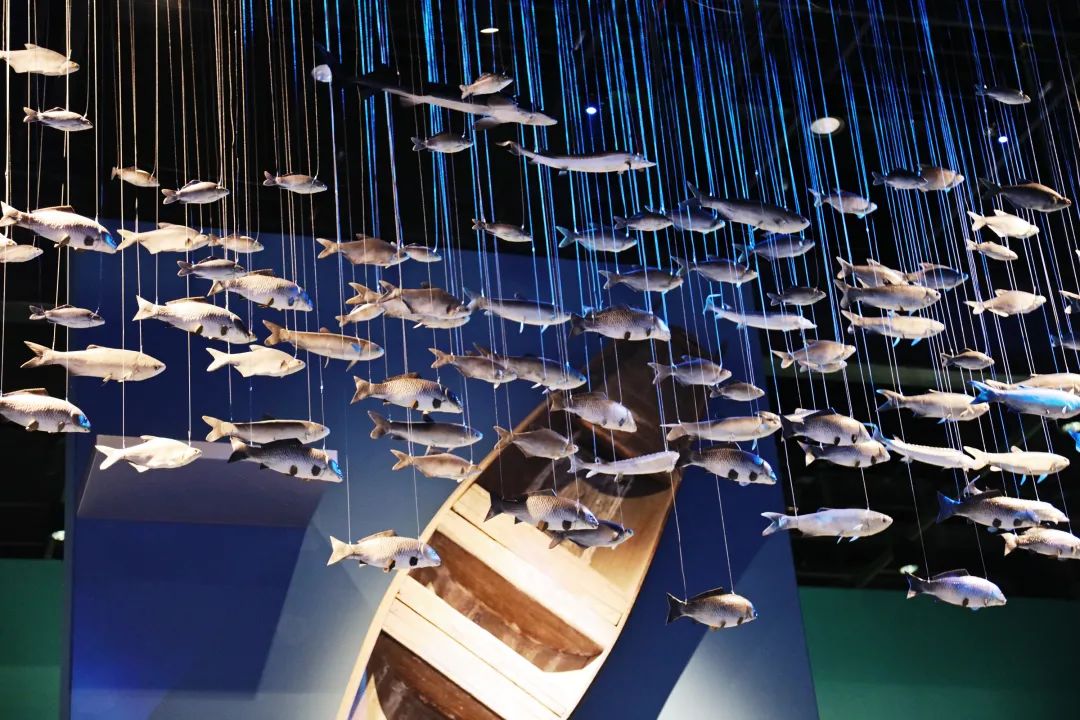 通过摆放渔船、发动机和禁捕队救生衣,复原江夏老旧老码头场景。船只岸边搁浅,捕鱼工具闲置,环绕在众多鱼类标本之中,能真实感受长江鱼类面临的生存挑战。
