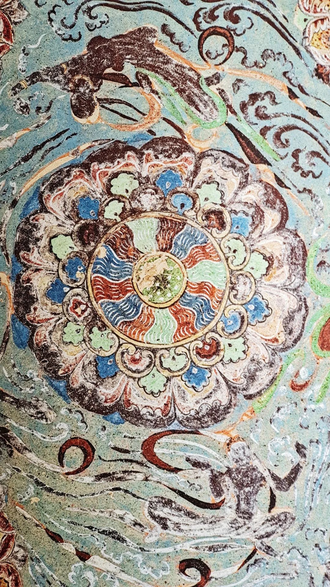 此窟覆斗形顶,莲花飞天井心。中心画莲花,花心呈五色转轮。四身持花飞天,在蓝天中,乘流动彩云,环绕莲花飞旋。边饰卷草、方格、联珠纹样及垂角幔帷,以深、浅红色为主,配以白、赭石、黄丹、色彩热烈,变化丰富。是初唐藻井的代表作之一。