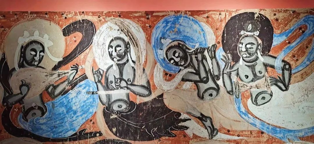 四飞天同一方向, 演奏琵琶、箜篌、横笛、腰鼓,娱乐于佛,通体色彩简 单朴质,线描流畅,用笔豪放,表情自然,明显地保留 着西域早期飞天的特色。