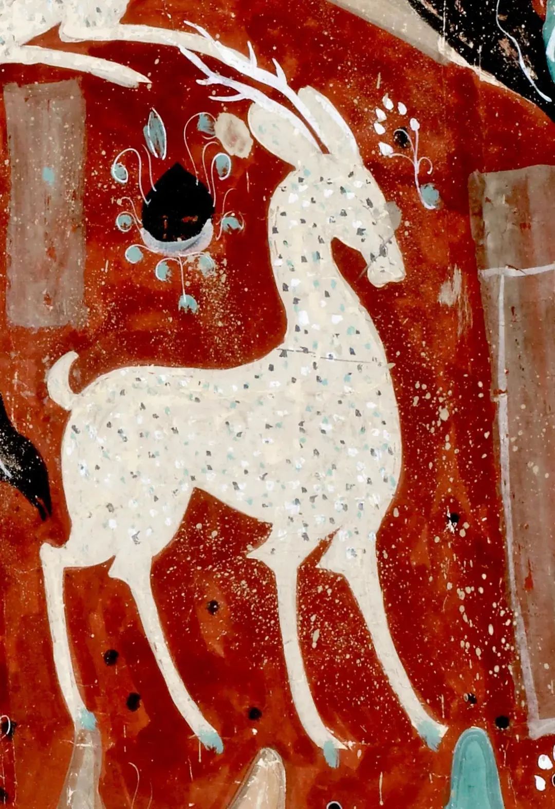 隋代第303窟在四壁及中心柱的下沿横卷式画面中,稀稀落落地分布着山峦和树木,树林中还画出鹿、羊等动物,或在觅食,或在奔跑,表现出山林自然的气息 。