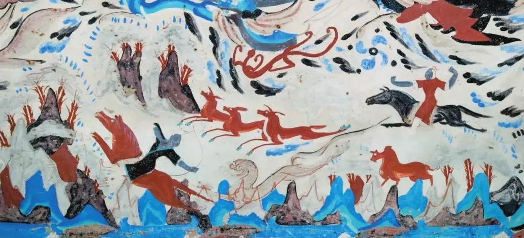 西魏第249窟窟顶四披下部描绘出连绵不断的山峦,这里更大的空间,使山水树木得到更为自由的表现。对山头的晕染则往往通过同类颜色的深浅变化来表现山峦的层次。这种深浅相递变化的配色更富有装饰性。窟顶北披画出一群活动于山中的野猪,野猪的上部又画出三座山峰,与下部的山峰相对,表现出一定的远近关系。