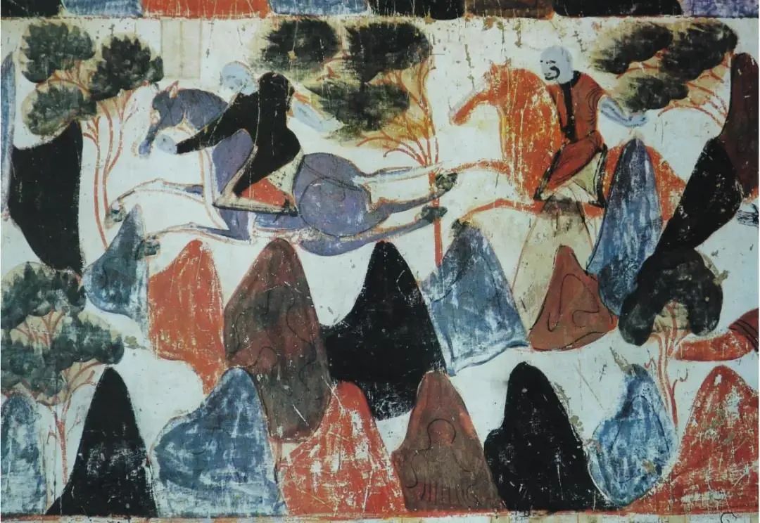 驼峰式的山头也体现出不同的形态,除了赭红色以外,就是黑色、白色。山峦上由深到浅的着色方法,似乎类似于后来的“皴法”的 特点。