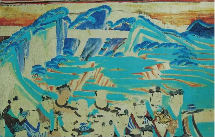 莫高窟第148窟背景的上部,山势表现得十分雄奇。在辽远的原野后面,危崖耸立,其中还画出一片白云把半山腰遮住。