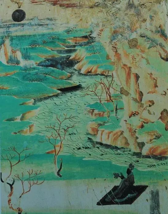 第323窟的故事画中,上部远景中几处画出了小舟,与山水相映成趣,表现了烟雨迷蒙的江湖景色。尽管线色脱落,但是仍可看出近处的波浪和远处的河流,特别是远景的点点帆影,颇有“孤帆远影碧空尽”的意境。