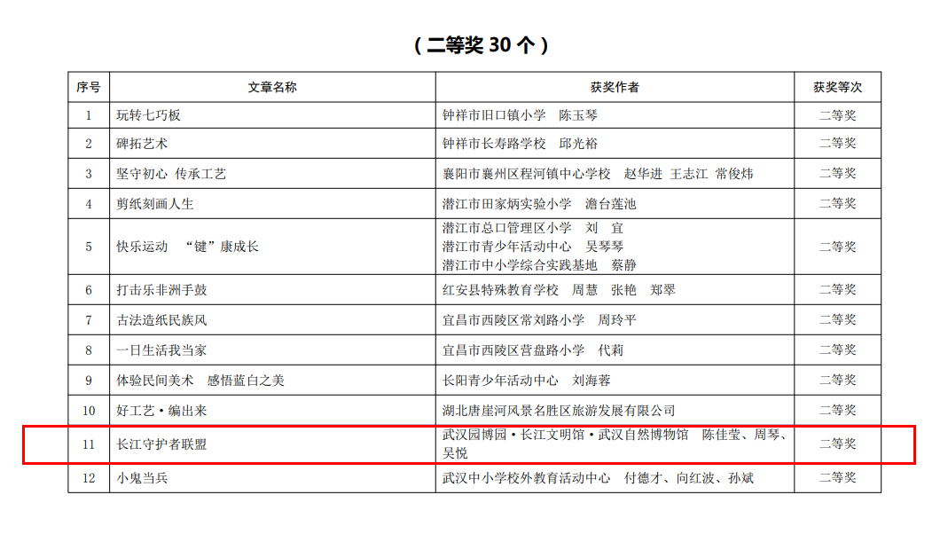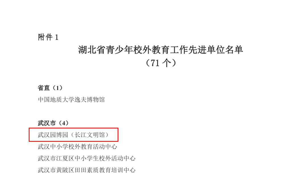 2022年1月4日,武汉园博园(长江文明馆)迎来新年首次研学荣誉奖项: 我馆被湖北省中小学校长协会校外教育管理专业委员会评为“2021年湖北省青少年校外教育工作先进单位”;我馆研学课程《长江守护者联盟》被评为“2021年省级校外教育课后特色活动项目优秀案例”二等奖。