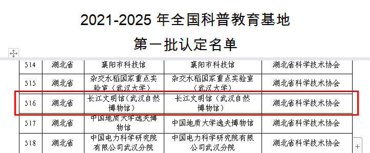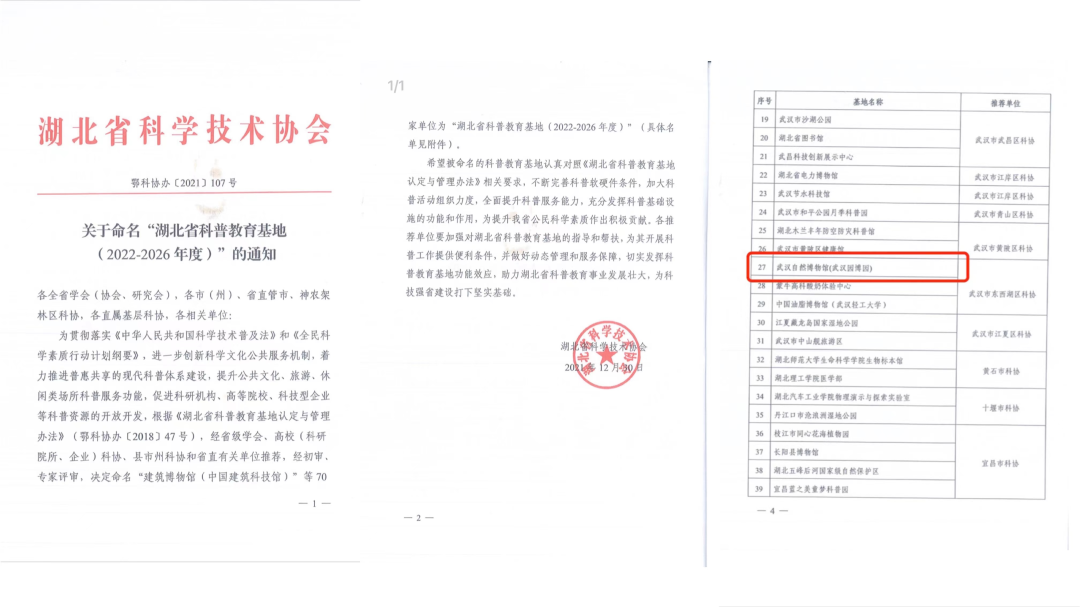 在湖北省科学技术协会下发的《关于命名“湖北省科普教育基地(2022-2026年度)”的通知》中,武汉自然博物馆(武汉园博园)榜上有名,被命名为“湖北省科普教育基地”。