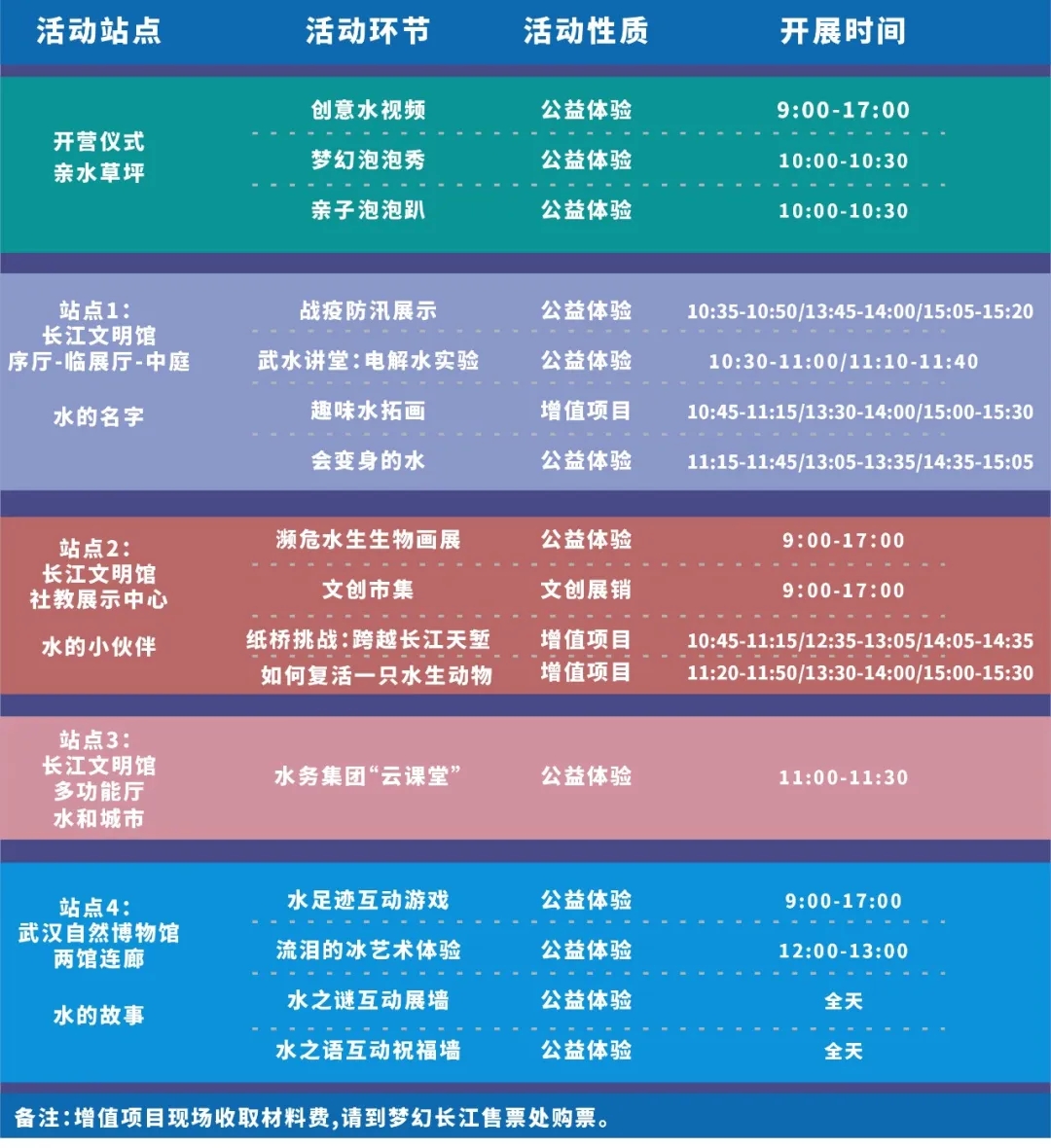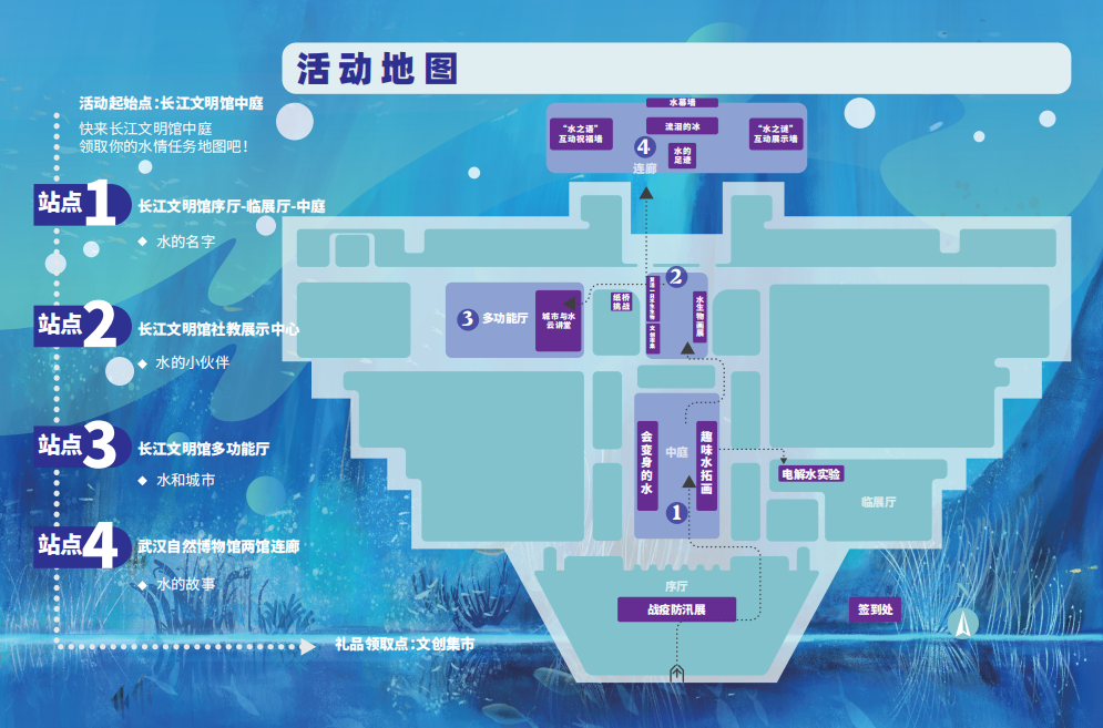 活动以“我们与水”为主题,分设4大站点,共16项子活动。参与者可在活动起始点长江文明馆东侧小广场签到处领取一份水情任务手册,每参与一项活动即可在该站点盖上一枚印章,成功集齐4枚印章,即可领取一份活动礼品。