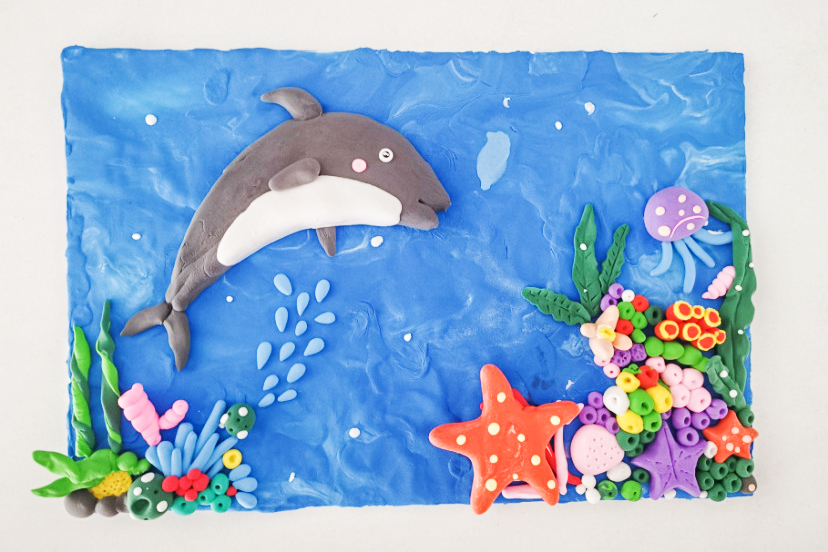 通过黏土捏制鲨鱼、海豚、鲸鱼等水生动物,营造水生生物生活场景,了解水生生物知识。