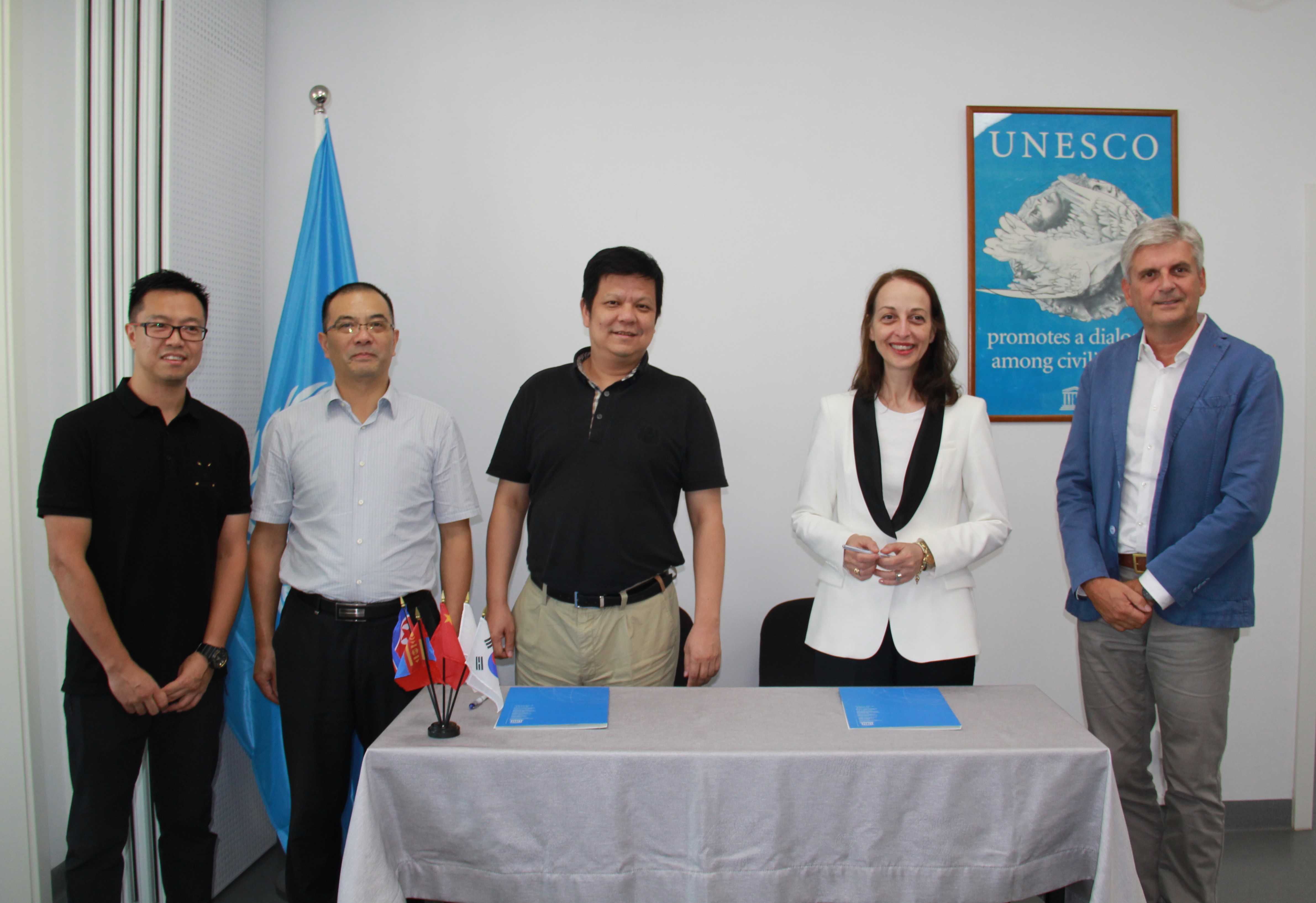 联合国教科文组织驻华代表处代表欧敏行女士(Ms Marielza Oliveira),联合国教科文组织驻华代表处自然科学项目专家贝斐然先生(Philippe Pypaert),武汉市文化局副局长张宏斌,武汉园发公司、长江文明馆(武汉自然博物馆)董事长吴涛,武汉市人民政府办公厅副处长张俊,长江文明馆(武汉自然博物馆)副馆长张肖雯参加了签字仪式。