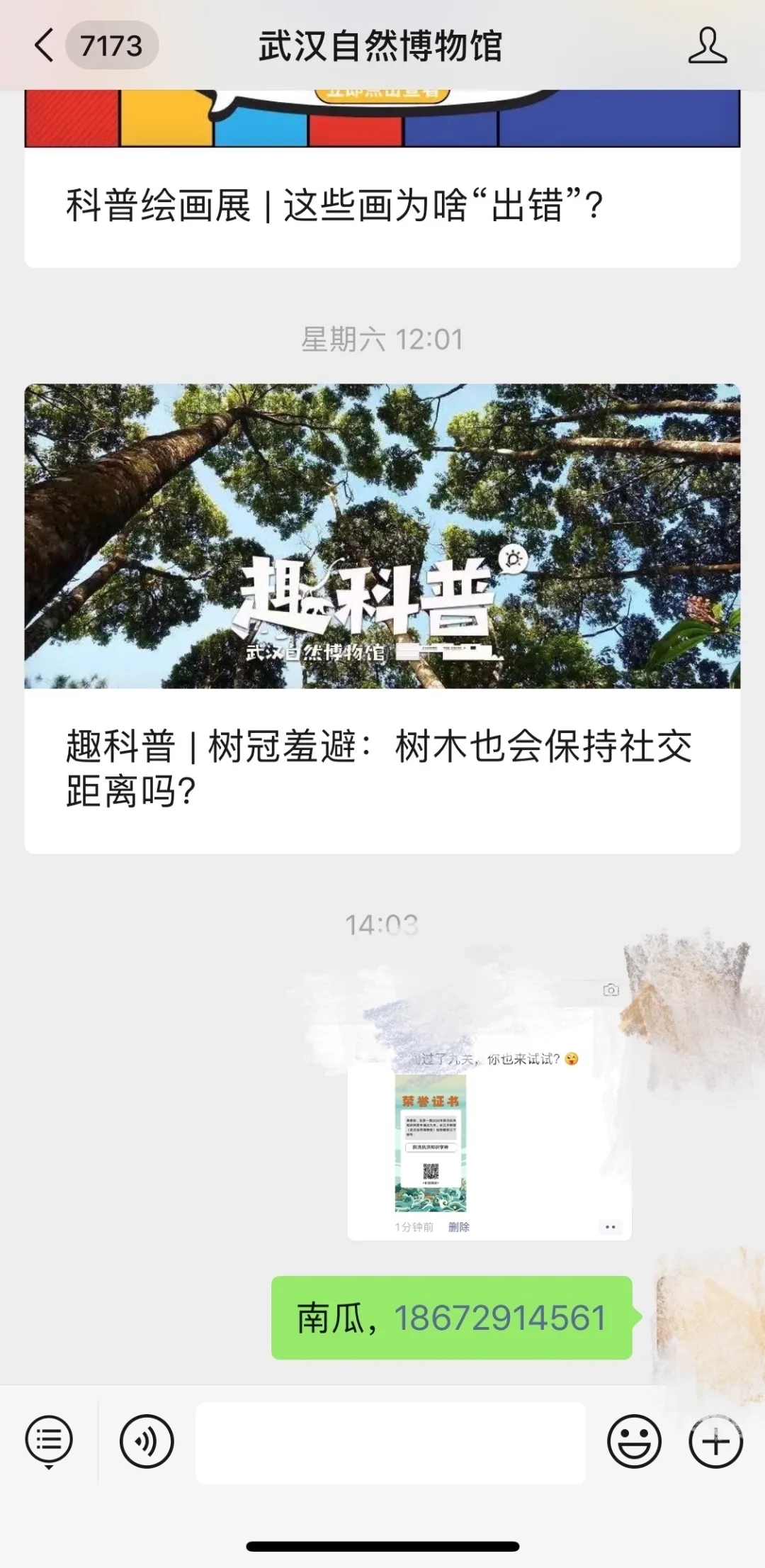 将朋友圈截图发至“武汉自然博物馆”微信公众号后台,并留下姓名及有效联系方式
