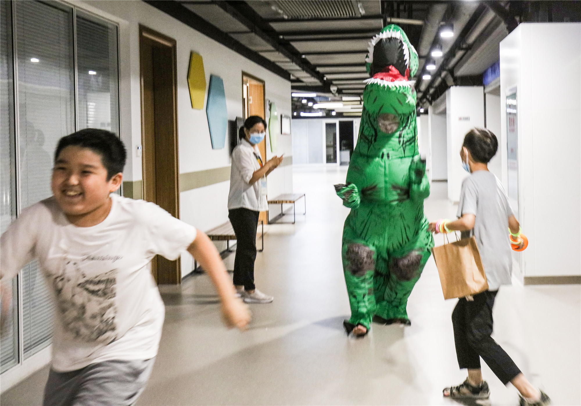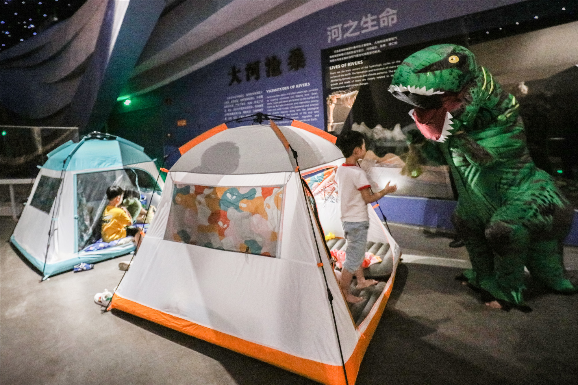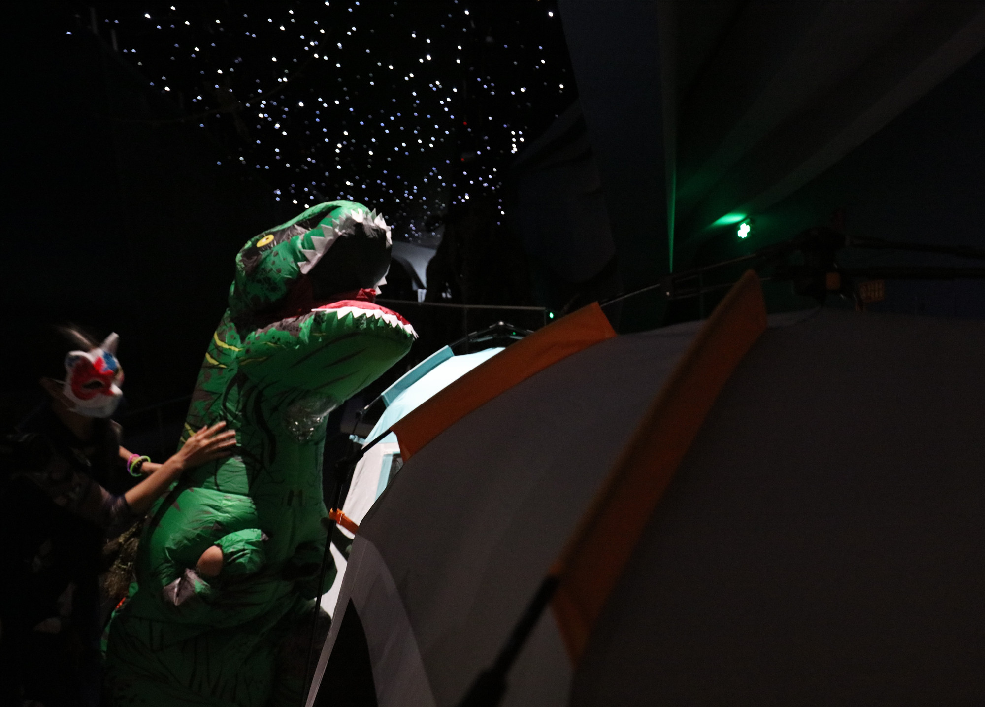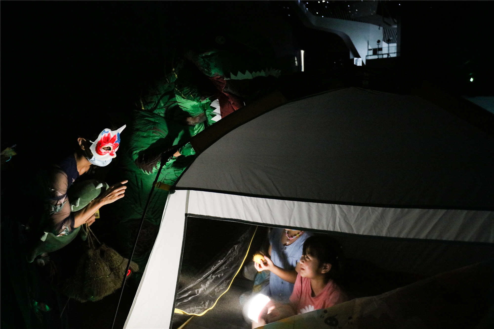 夜宿区域,一只超级恐龙正慢慢地靠近帐篷……孩子们的尖叫声、欢呼声,不绝于耳。