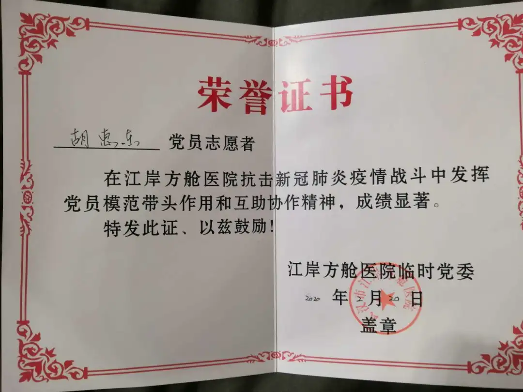 无私奉献、帮助他人,一直是胡惠东秉持并切实践行着的志愿理念。2020年1月24号,武汉封锁交通的第二天,他就报名加入了硚口区疫情防控志愿者队伍,承担运送物资、转运患者、送药送菜、接送医护人员上下班等任务;2月3日,作为工作单位第一批下沉社区的党员紧急奔赴社区防控一线。在这期间,他不慎感染新冠病毒,在进入方舱医院诊疗期间,又主动加入江岸方舱医院临时党支部和志愿者团队,为医护人员及其他病友提供力所能及的帮助,清洁、取送饭菜、为患者充当武汉话翻译等等。3月13日,出院后的胡惠东第一个想法是“隔离期结束就去捐献血浆,用我的血救更多的人”。