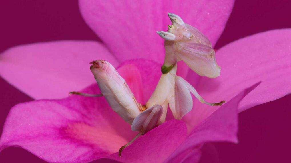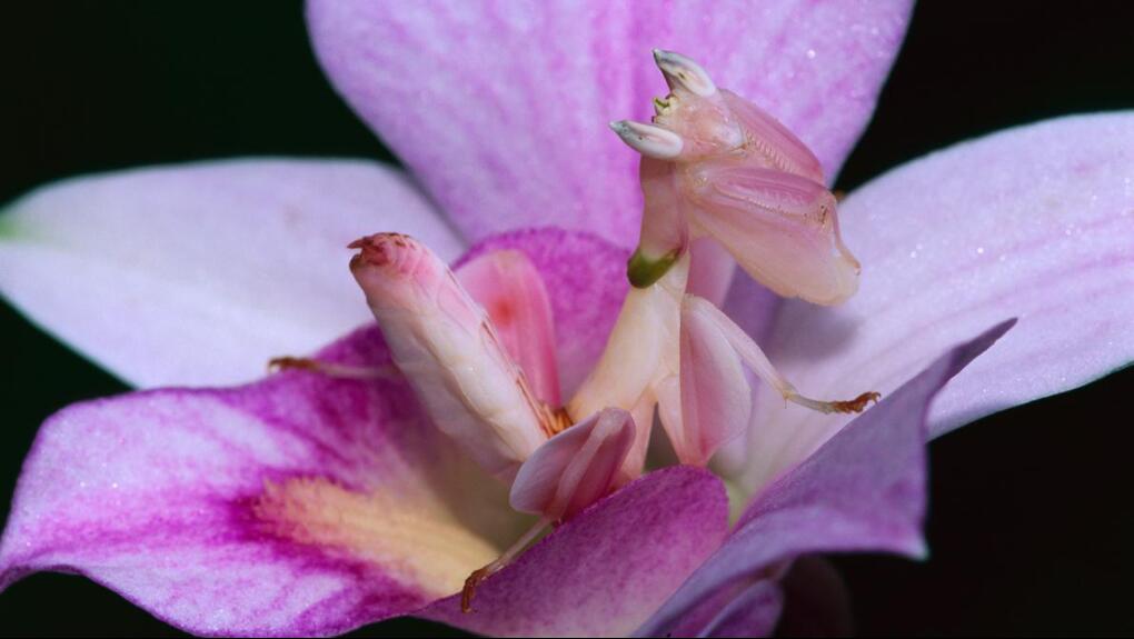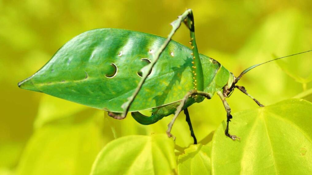 看似兰花的花蕊,实则是一只潜伏着等待猎物上门的螳螂,长了虫眼的叶子居然是虫子本虫——一只大螽斯,是不是中间的“冬虫虫”不太会读?其实就是俗称的蝈蝈儿……