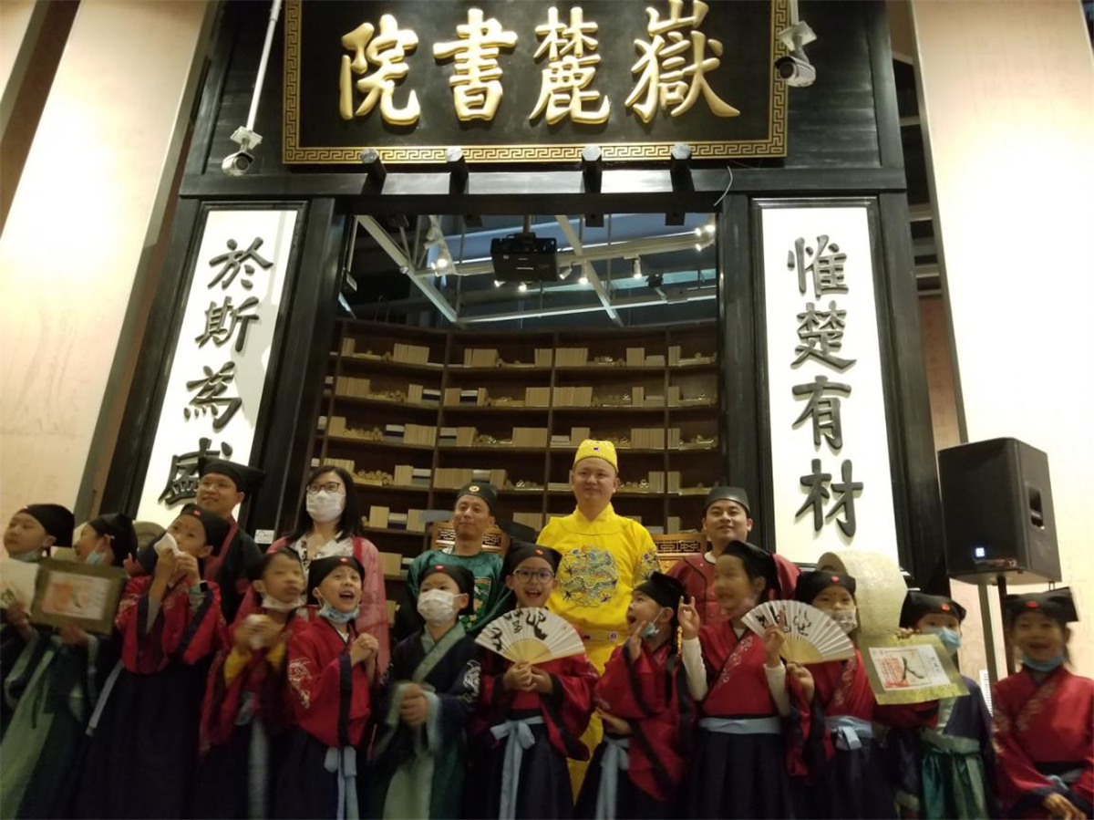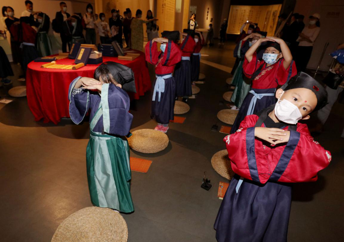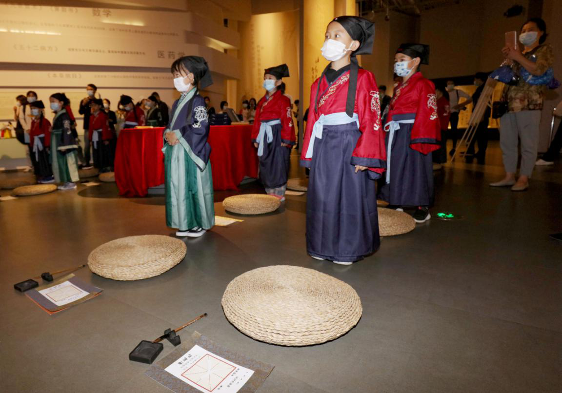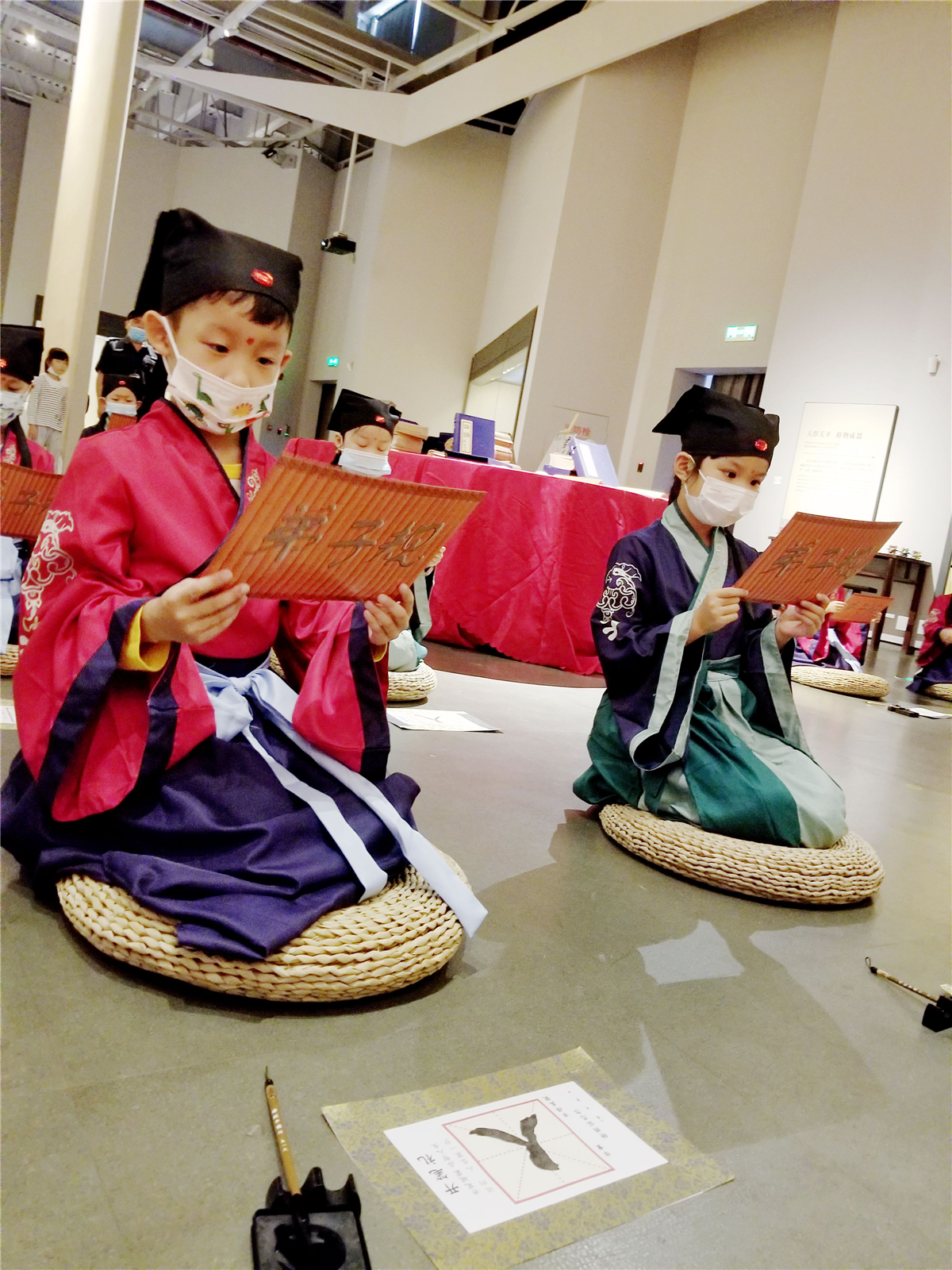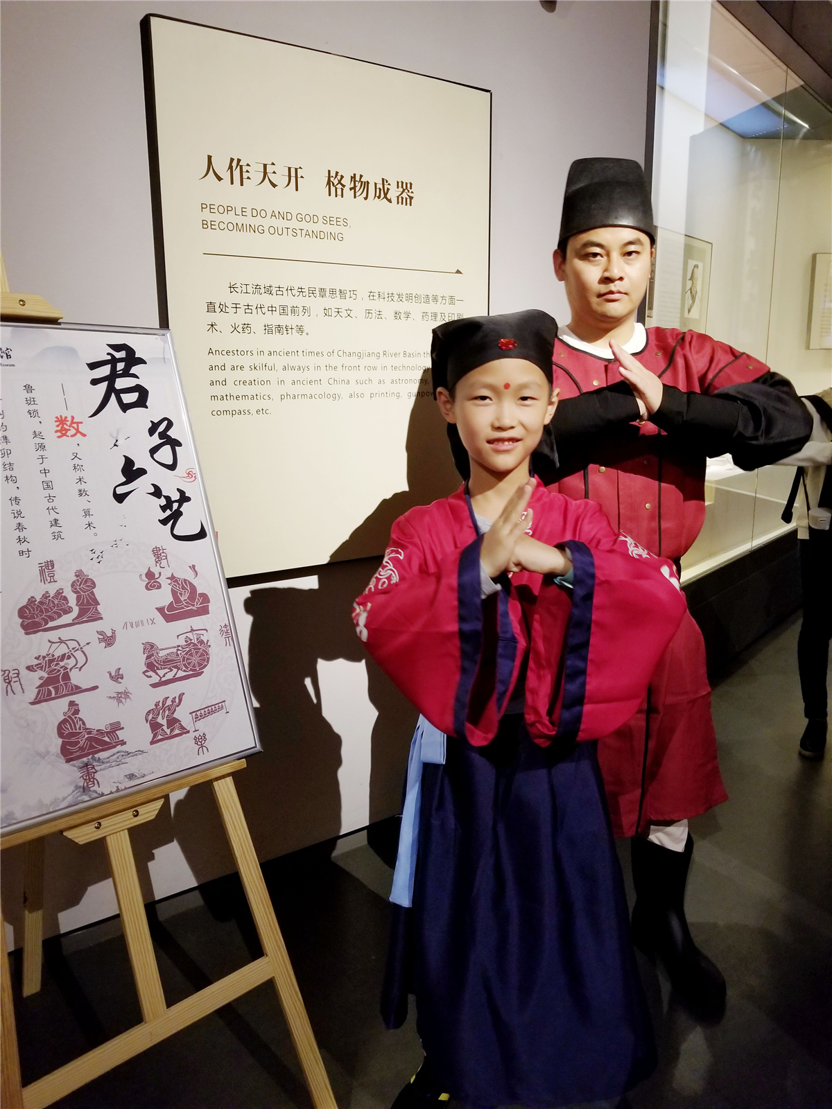 9月19日下午2时许,武汉园博园长江文明馆感知文明厅传来《弟子规》的朗朗诵读声。20余名小朋友和家长身着汉服,穿越时空,在岳麓书院“山长”的教授下,学礼、击乐、投壶、御驾、书扇、合榫,研习“君子六艺”,沐浴国学之风,体验中华传统文化魅力。