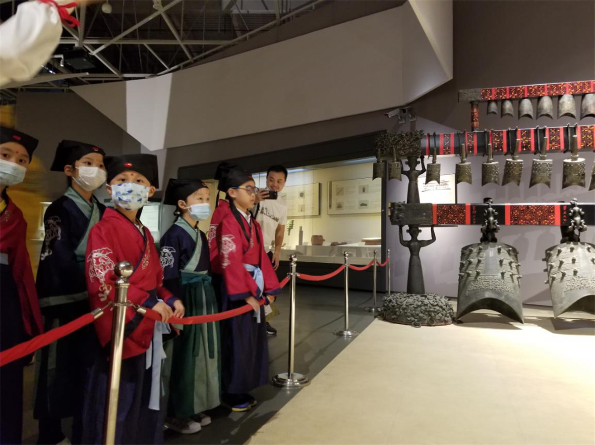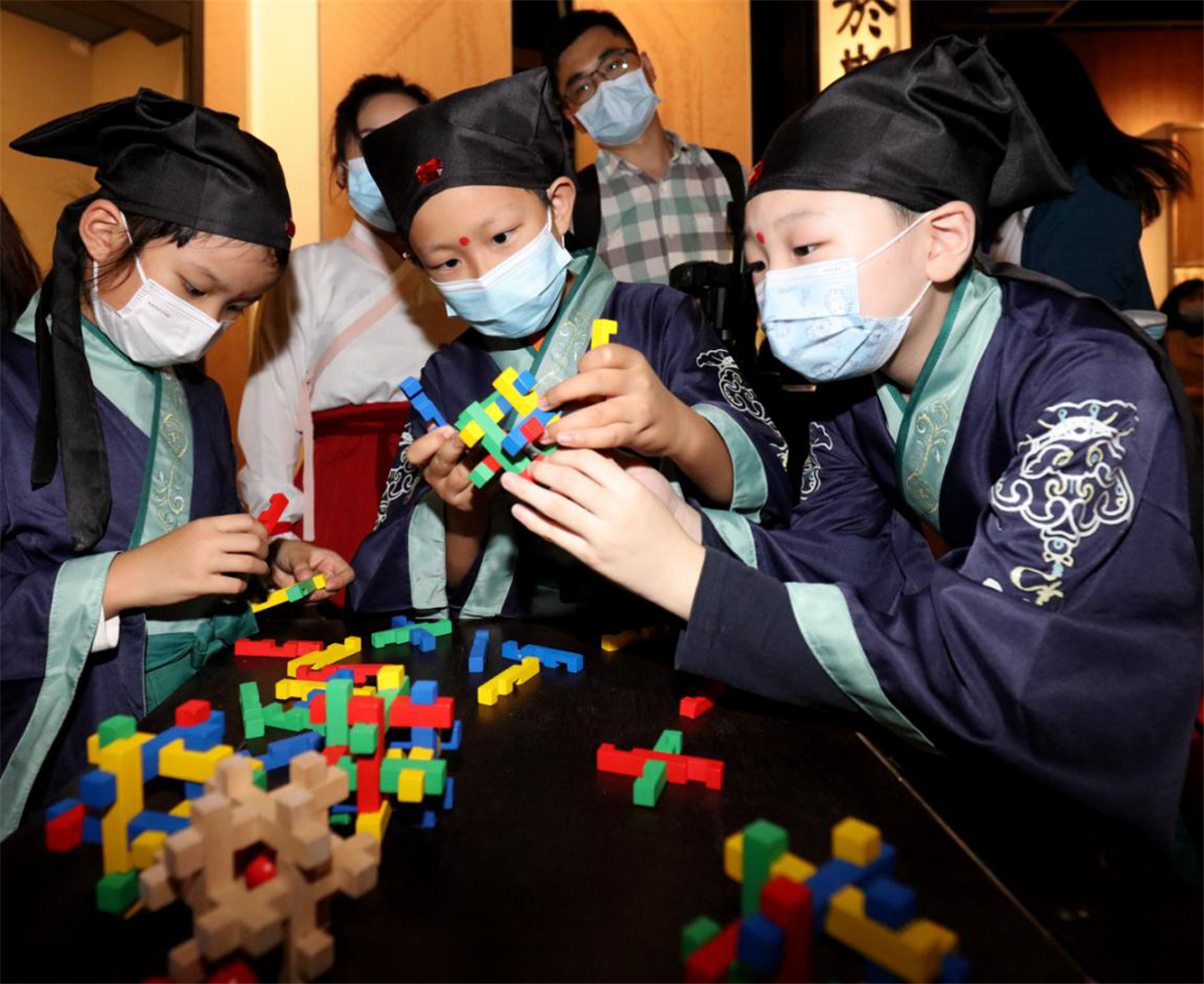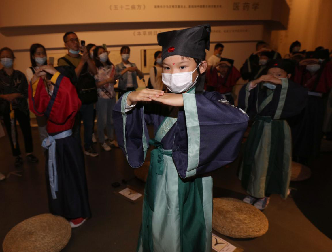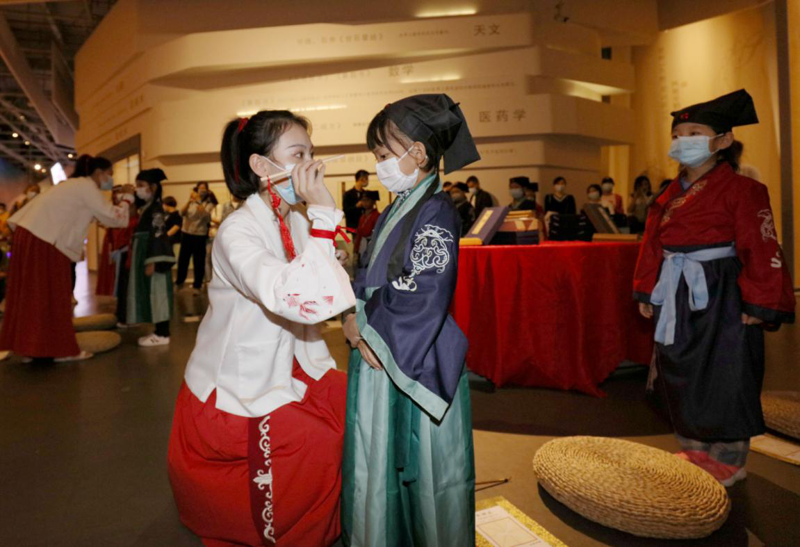 9月19日下午2时许,武汉园博园长江文明馆感知文明厅传来《弟子规》的朗朗诵读声。20余名小朋友和家长身着汉服,穿越时空,在岳麓书院“山长”的教授下,学礼、击乐、投壶、御驾、书扇、合榫,研习“君子六艺”,沐浴国学之风,体验中华传统文化魅力。