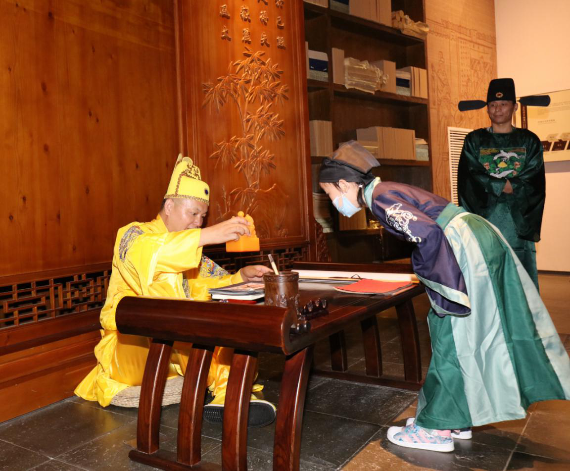 “皇帝”亲临岳麓书院,为通过殿试的学童们加盖御印,祝福“天子门生”学业有成、大展鸿图。连中三元的学子,荣登皇榜,获赐状元饼。