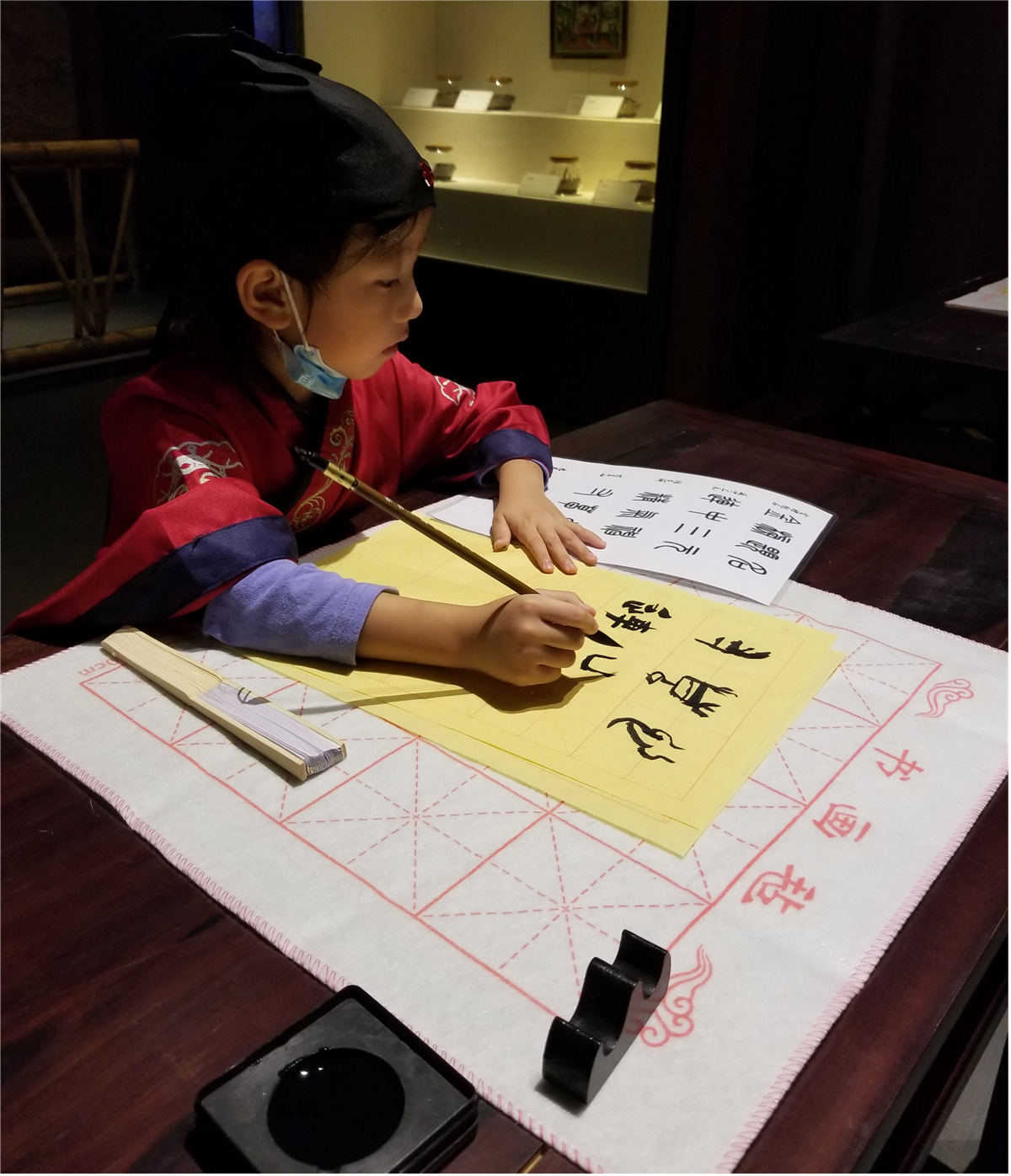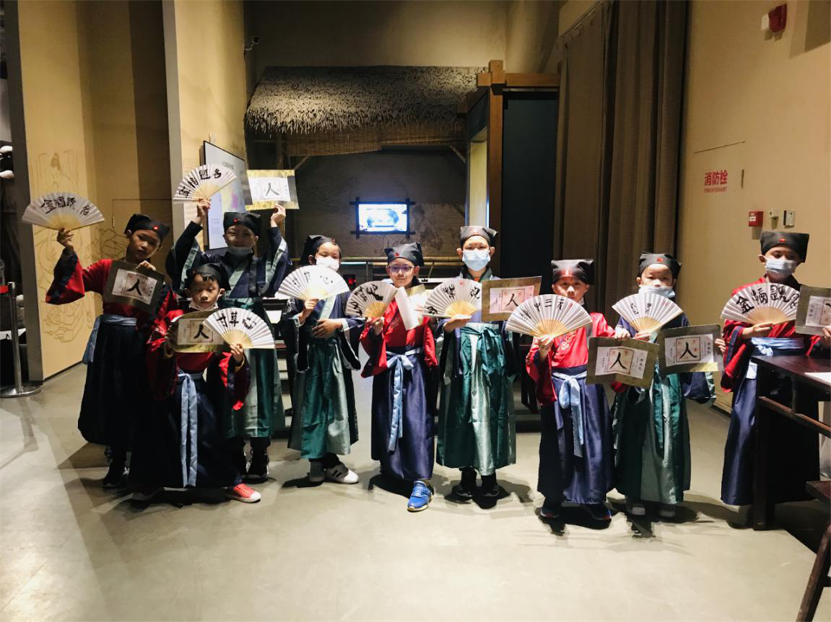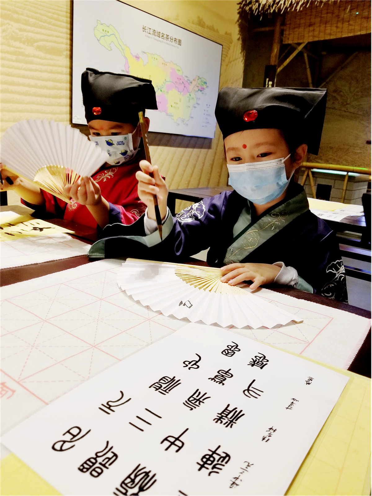 书,不仅是一种高雅技艺,更是一种修心养性的工具和法宝。《汉书》:“古者八岁入小学,故周官保氏掌管国子,教之六书,象形、象事、象意、象声、转注、假借,造字之本也。”茶文化展区,学童们边了解茶文化,边学习篆书字本,临摹练习,掌握篆要点,折扇题字,“书”之雅致。