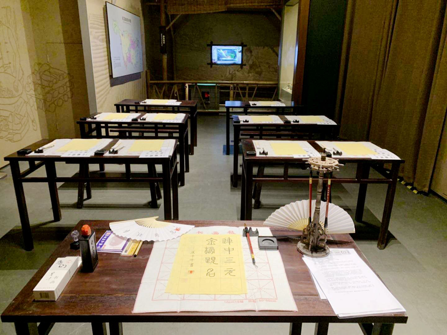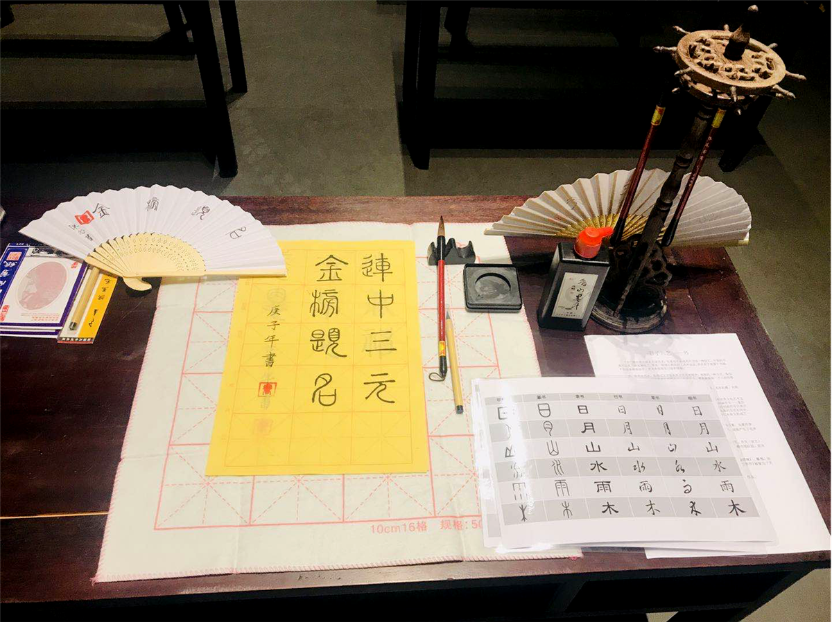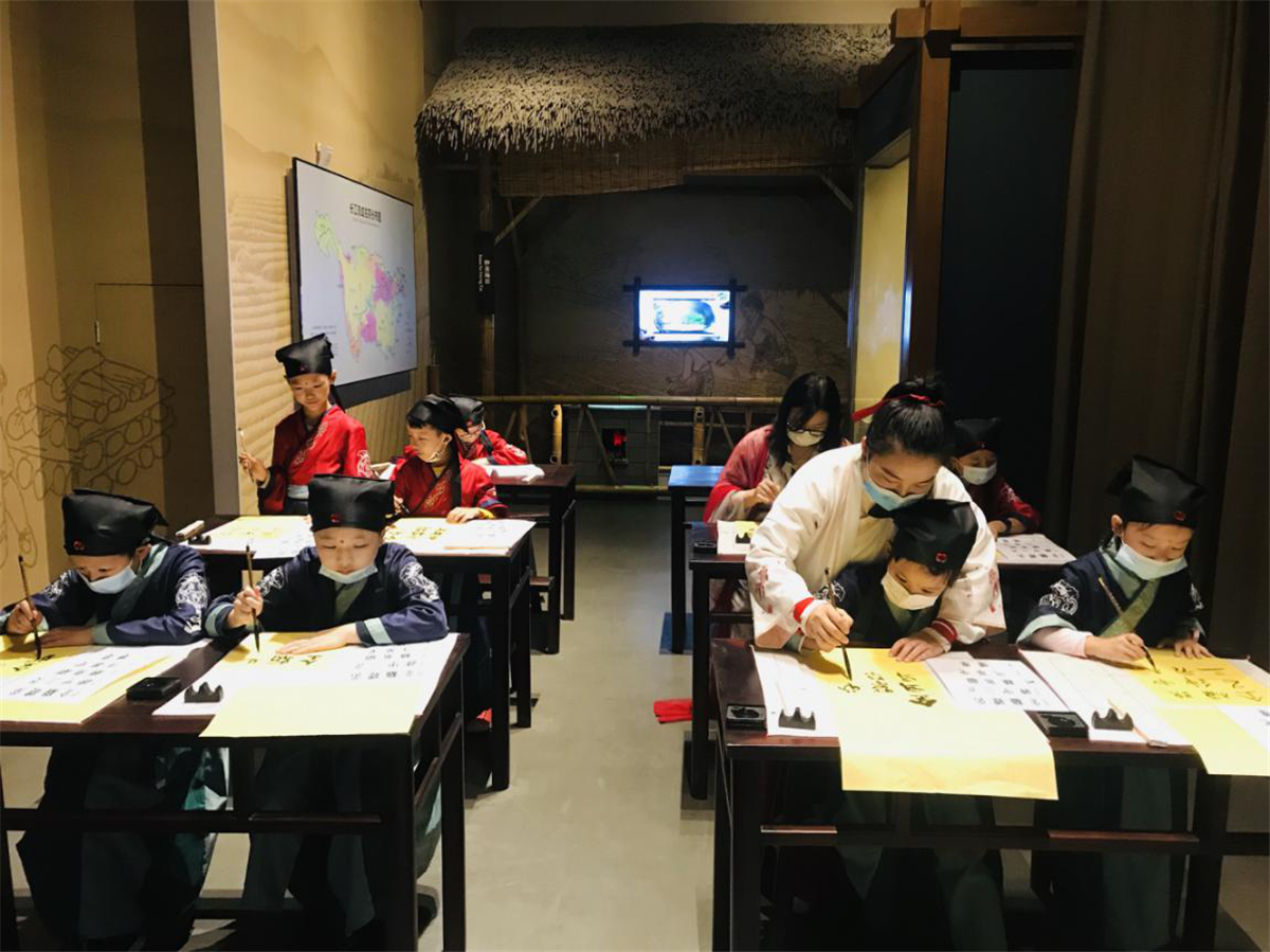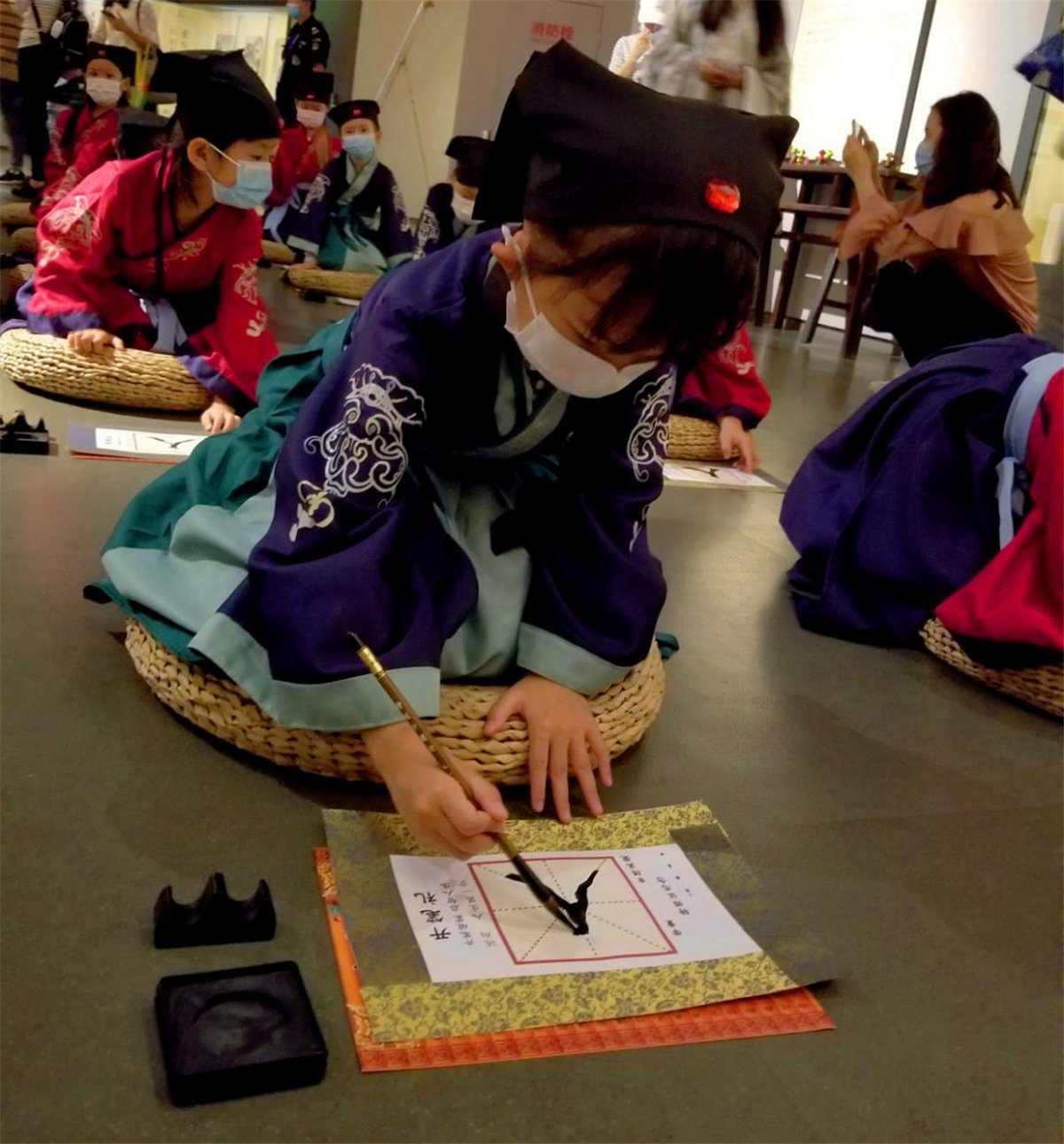 书,不仅是一种高雅技艺,更是一种修心养性的工具和法宝。《汉书》:“古者八岁入小学,故周官保氏掌管国子,教之六书,象形、象事、象意、象声、转注、假借,造字之本也。”茶文化展区,学童们边了解茶文化,边学习篆书字本,临摹练习,掌握篆要点,折扇题字,“书”之雅致。