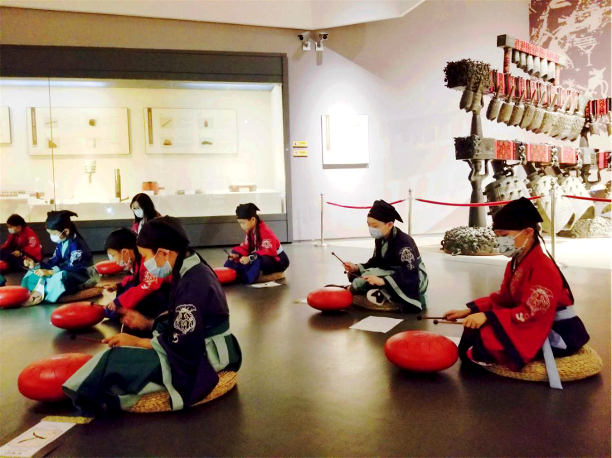 乐,音乐。六乐:指《云门大卷》、《咸池》、《大韶》、《大夏》、《大濩》、《大武》六套乐舞。古代乐器展区,“夫子”给学童们讲述曾侯乙编钟历史故事,并现场传授空灵鼓的击打技法。空灵鼓受西周编钟启灵,以悠远、深沉、醇厚的音质为特色。《好一朵美丽的茉莉花》、《小星星》的旋律依次响起,学童们演奏得不亦乐乎,家长们也陶醉在孩子们即兴演奏的乐曲中……