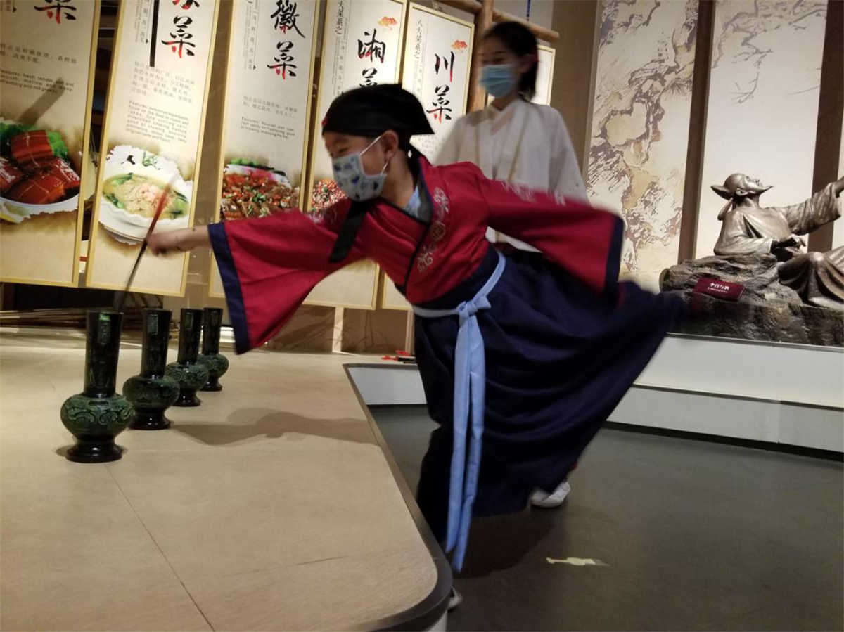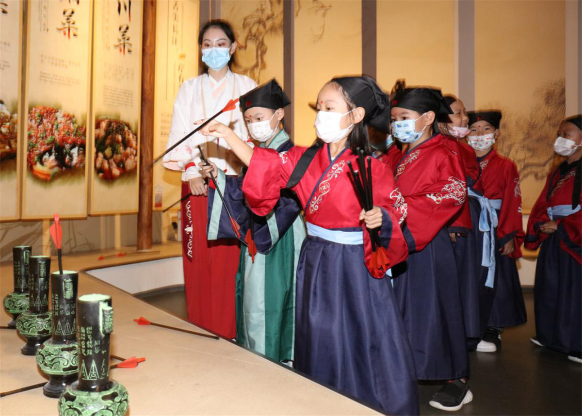 投壶,源自射礼,是中国传统礼仪,也是古代士大夫宴饮时的助兴游戏。在战国时期较为盛行,尤其是在唐朝,得到了发扬光大。投壶是把箭向壶里投,投中多的为胜,负者照规定的杯数喝酒。《醉翁亭记》中的“射”指的就是“投壶”游戏。酒文化展区,学童们手执以无镞之箭,在“夫子”的指导下,投壶竞赛,“射”技大比拼。