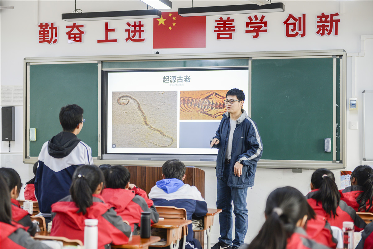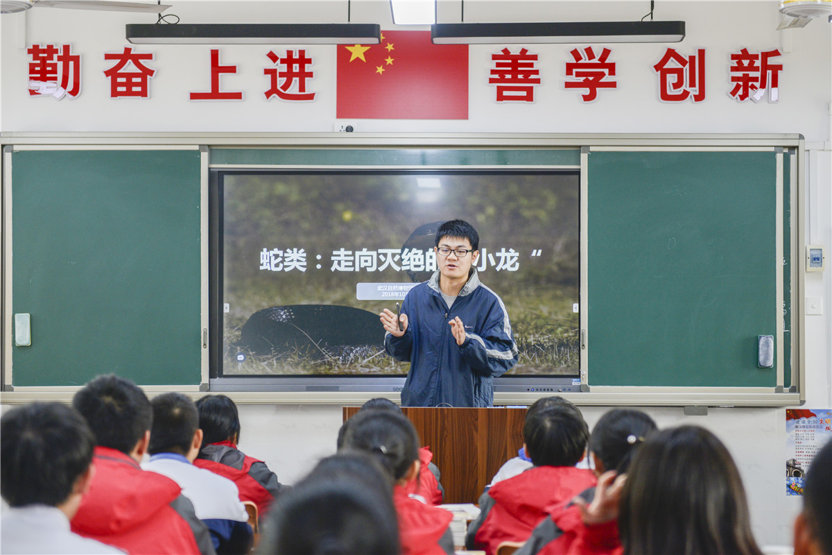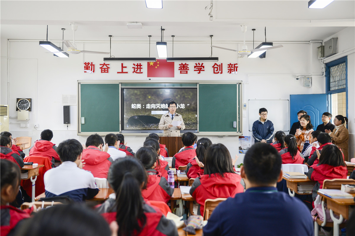 11月18日,武汉市第二十三中学(墨水湖校区)高一(1)班,长江文明馆(武汉自然博物馆)的社教老师以“蛇类:走向灭绝的‘小龙’”为主题,用生动的语言和和渊博的知识对大众谈之色变的生物——蛇进行了深入浅出的科普。