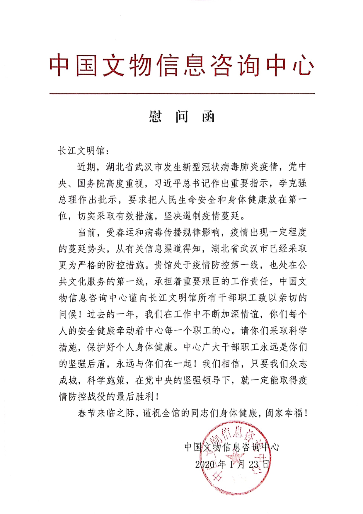 自疫情开始以来,长江文明馆(武汉自然博物馆)陆续收到各界同仁的关心与慰问:中国文物信息咨询中心在武汉封城当天即发来慰问函,函中“中心广大干部职工永远是你们的坚强后盾,永远与你们在一起”令人动容;国家方志馆黄河分馆在慰问函中写道“一源三江,同根同源,我们是姐妹馆,我们是一家人,我们始终与你们同呼吸、共命运、心连心”,让身处疫区的全馆上下感受到众志成城的温暖与力量;全国水利博物馆联盟在慰问信中表示,“联盟将根据实际需要,倡议各成员单位开辟渠道筹措物资,为帮助武汉兄弟单位共渡难关贡献绵薄之力”,让我们更具战胜这场疫情的信心。