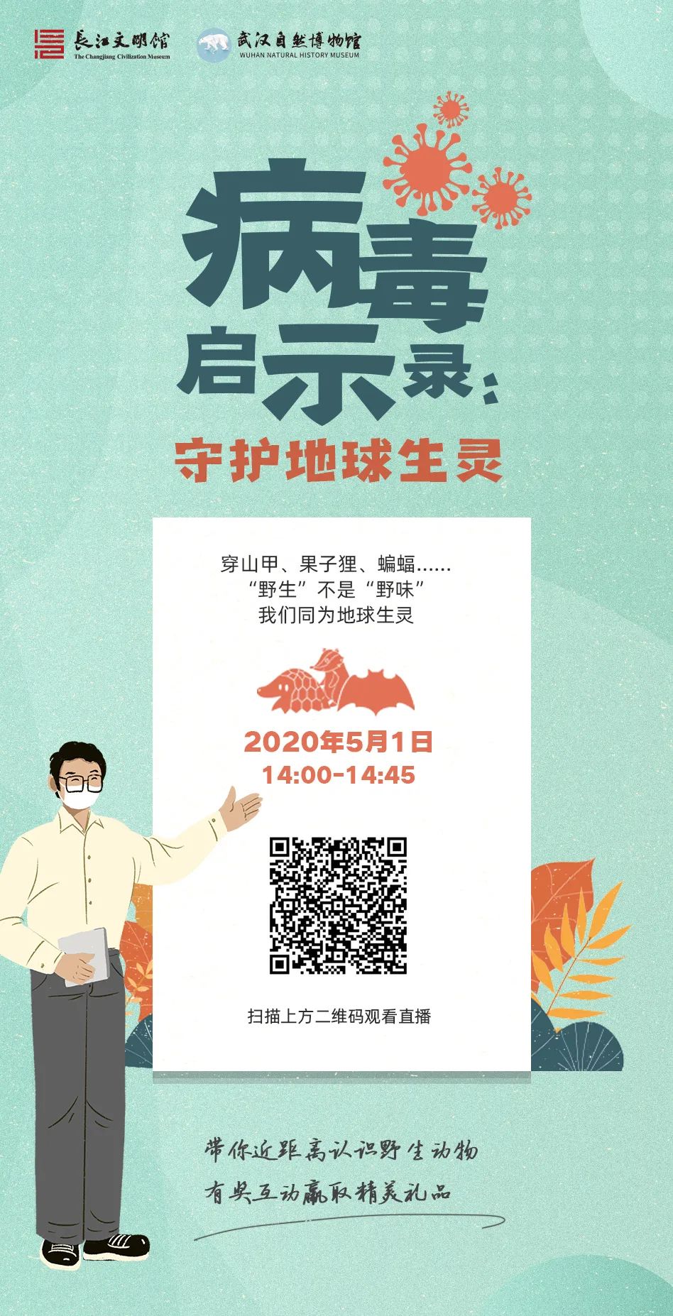 在直播活动里,武汉自然博物馆的科普老师将带大家认识和了解穿山甲、果子狸、蝙蝠等野生动物。